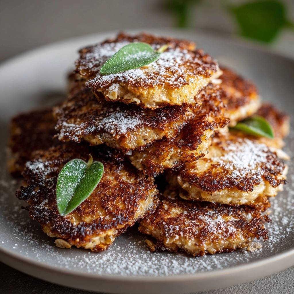 Der erste Biss in diese knusprigen Hafer-Salbei-Pfannkuchen ist pure Freude. Außen goldbraun und bissfest, innen zart und saftig. Der frische Salbei bringt eine herbe Note, die mit dem Puderzucker tanzt.
