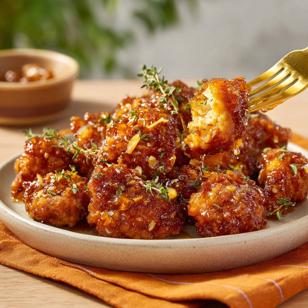 Mit frischem Thymian und zusätzlichen Sesamsamen garnieren und direkt genießen!Serviere die Häppchen sofort, um die maximale Knusprigkeit zu bewahren und den vollen Geschmack zu erleben, bevor die Glasur die Panade weicher werden lässt.