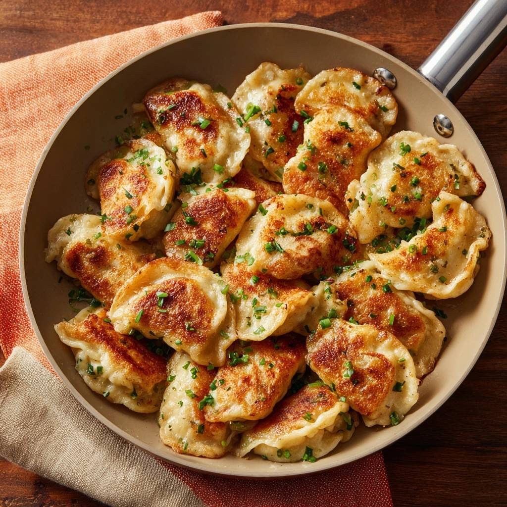 Kartoffel oder Pilz-Pierogi funktionieren gleich. Immer heiß vorheizen, portionsweise. Feuchte Füllungen trocknen leicht abtupfen vor Braten.