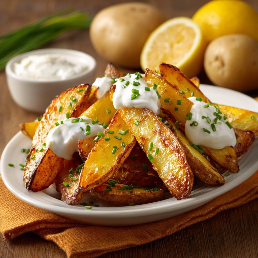 Knusprige Kartoffelkeile mit Zitronen-Sauerrahm (Nie wieder matschige Keile!)