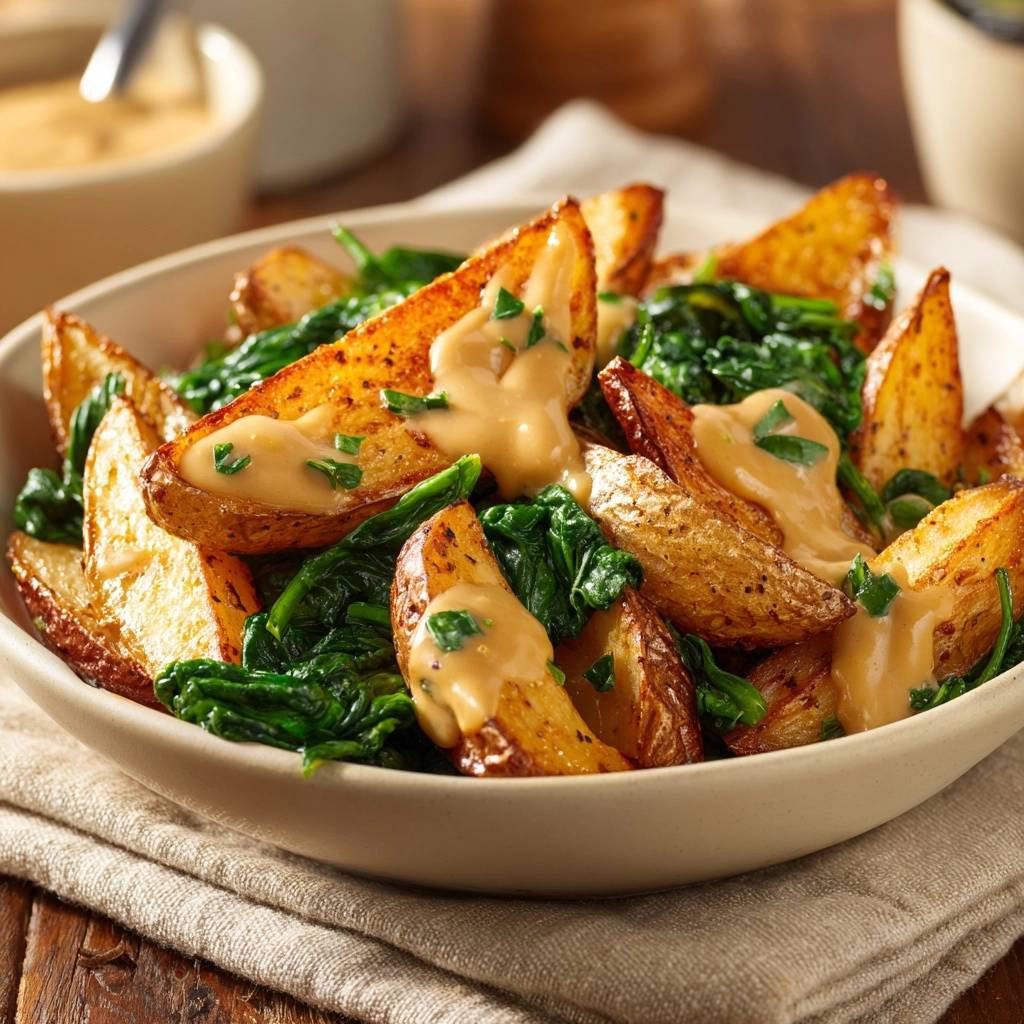 Stell dir vor, du beißt in eine Kartoffelwedge ab. Außen knackt es goldbraun und knusprig, innen ist sie weich und fluffig. Der Spinat daneben bringt Frische, und die Kräutersauce haucht cremig darüber. Das ist pure Freude am Teller.