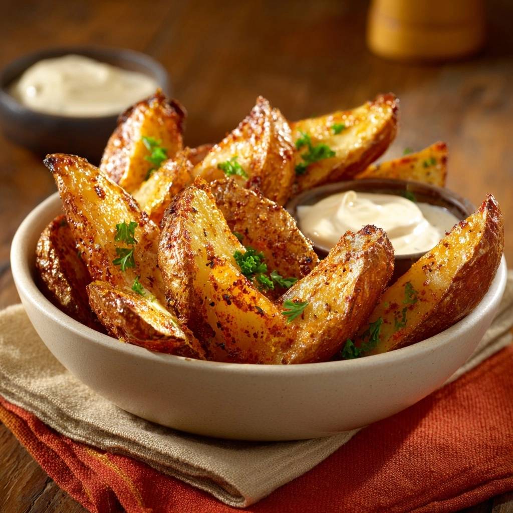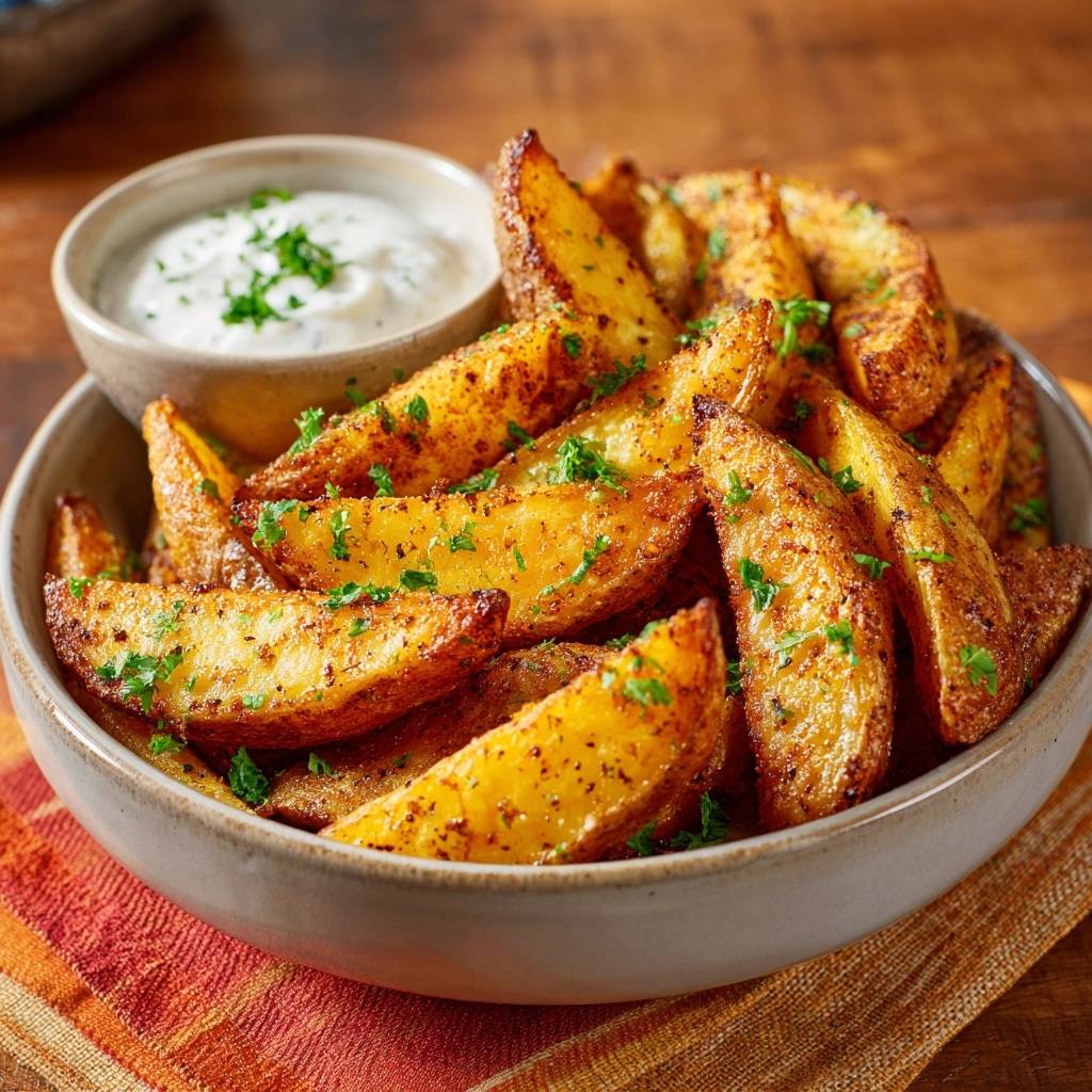 „`Knusprige Ofen-Kartoffelwedges mit Kräuter-Dip