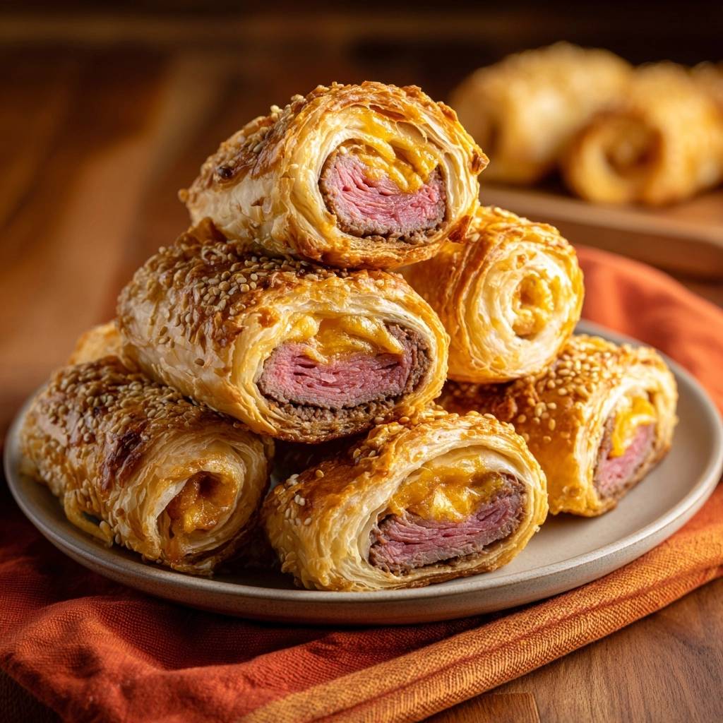 Der erste Biss knackt durch die Sesamkruste, dann explodiert schmelzender Käse mit zartem Putenaroma im Mund. Diese Rollen sind pure Wonne, fluffig innen, knusprig außen. Du spürst die Schichten des Blätterteigs sofort.
