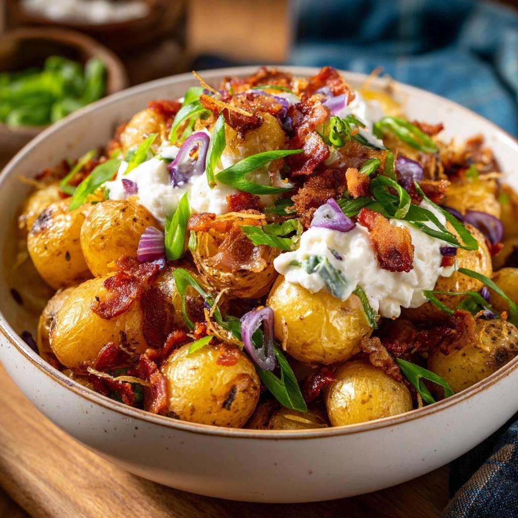 - Anrichten: Nimm die heißen Kartoffeln aus dem Ofen und häufe sie in einer großen Servierschüssel an. Verteile großzügige Kleckse kühlen Sauerrahm direkt auf den Kartoffeln. Streue den krossen Speck, die roten Zwiebelringe und die Frühlingszwiebeln großzügig darüber. Mit frisch gemahlenem Pfeffer garnieren und sofort servieren, solange die Kartoffeln maximal knusprig sind.