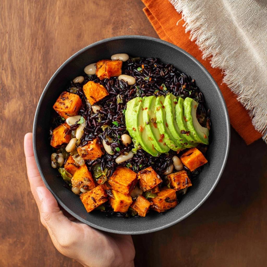 Stell dir vor, du beißt in diese vegane Power-Bowl rein. Der schwarze Reis gibt nussigen Biss, cremige weiße Bohnen sorgen für Sättigung, frischer Spinat knirscht, Avocado schmilzt cremig, und Koriander bringt Frische. Alles in perfekter Balance. Der Duft aus dem Ofen? Unwiderstehlich würzig-süß.