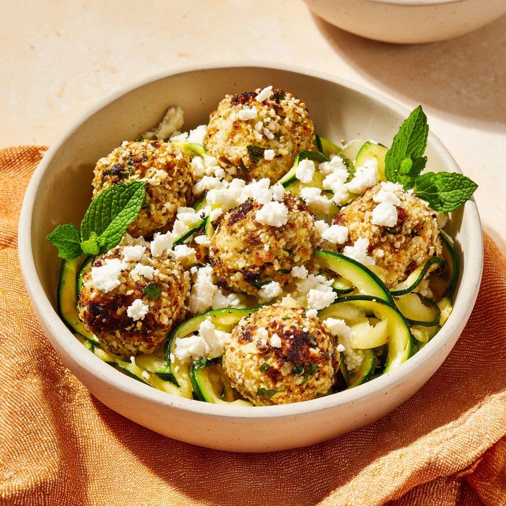 Stell dir vor, du beißt in ein knuspriges Zucchini-Bällchen, das außen goldbraun knistert und innen saftig mit Minze duftet. Der Feta schmilzt obendrauf, und die Zoodles darunter sind al dente wie echte Pasta, aber ohne Kohlenhydrate. Ich hab das so oft vermasselt: Zucchini raspeln, Bällchen formen, und zack, alles matschig und zerfällt in der Pfanne.