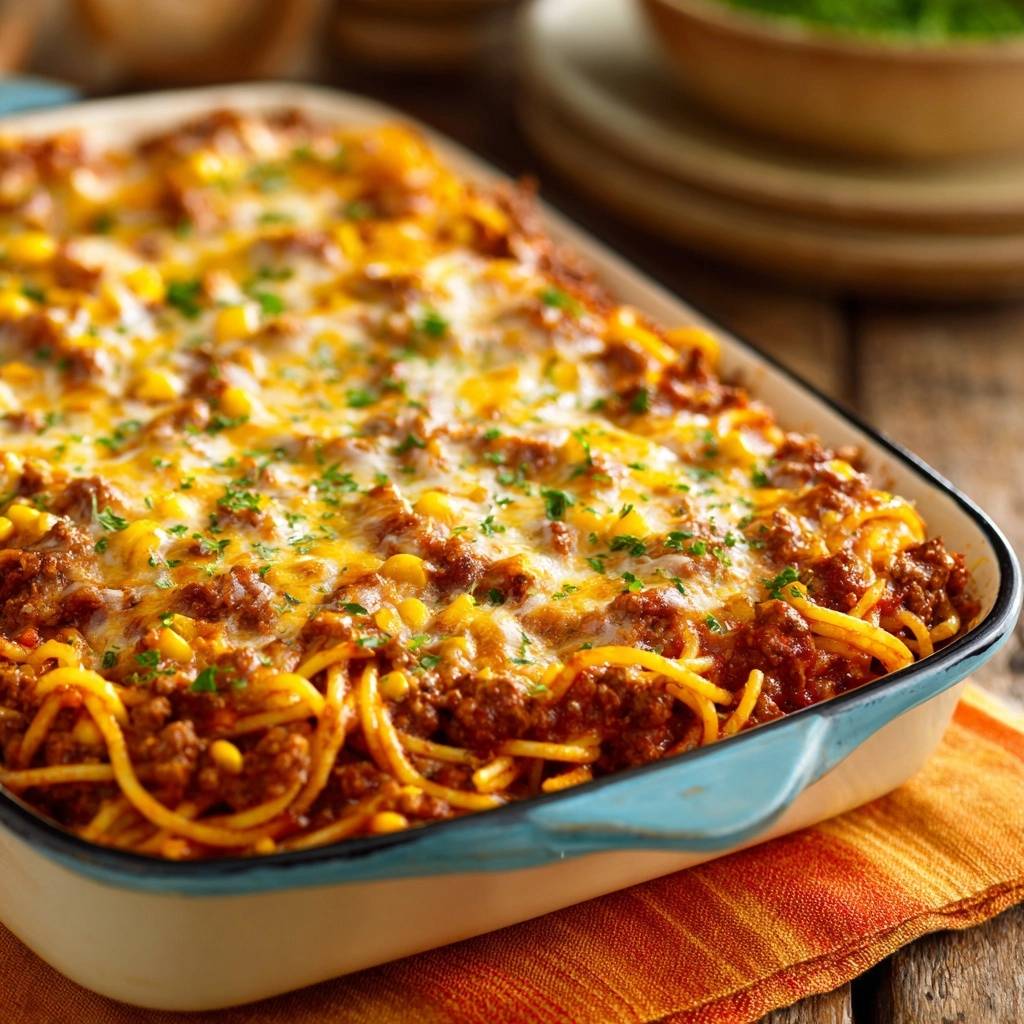 Knuspriger Hack-Nudelauflauf mit Mais und Käse