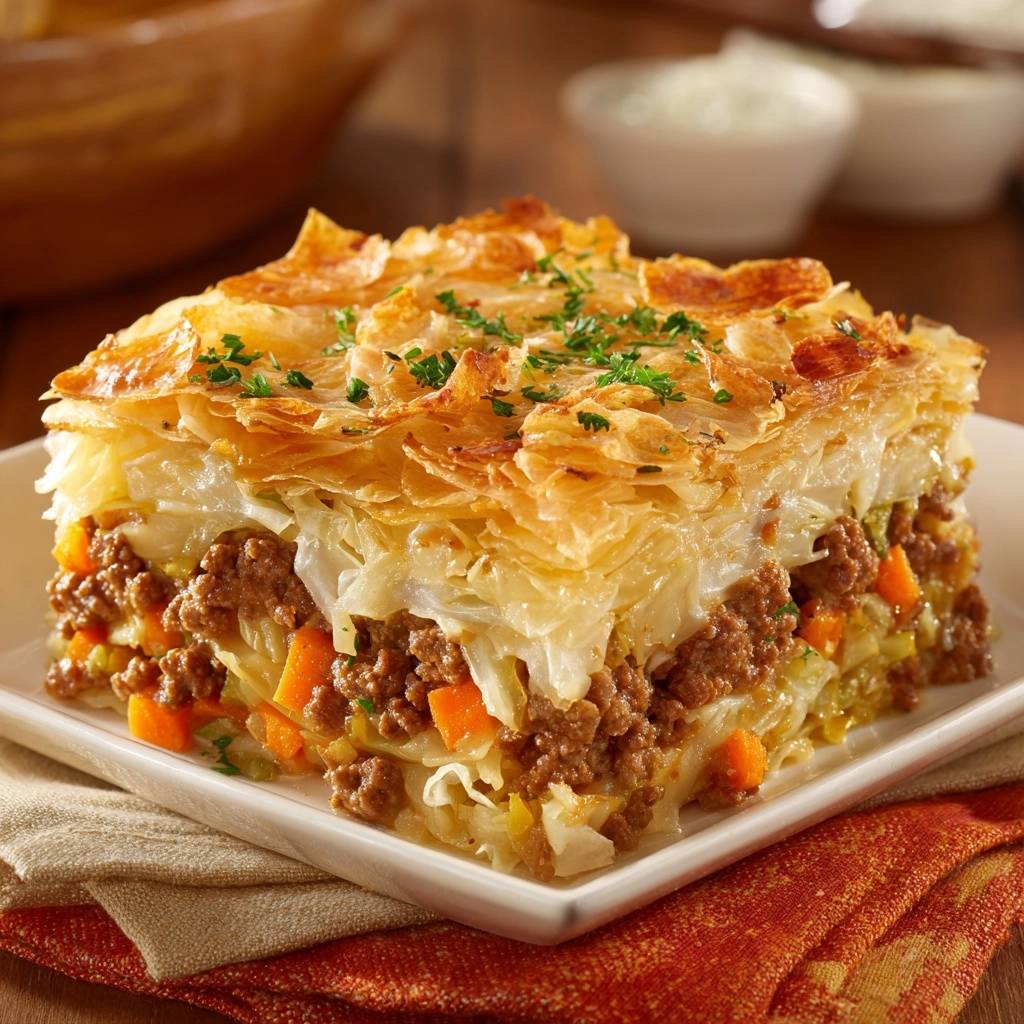 Stell dir vor, du beißt in eine Schicht goldbraunen Filoteigs, der perfekt knusprig knackt. Darunter wartet saftiges Hackfleisch mit knackigem Weißkohl und süßen Karottenwürfeln. Der Duft von gebratenem Fleisch und Gemüse zieht durch die Küche, und jeder Bissen ist eine Explosion aus Texturen.