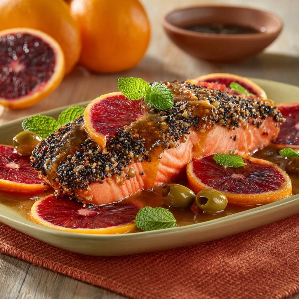 Leg den Lachs auf Teller. Garnier mit Blutorangenspalten, frischen Minzblättern und Oliven. Die Farben poppen, und es schmeckt knackig-frisch. Servier sofort, heiß und saftig.