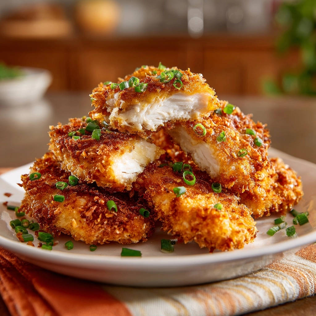 - Serviert die knusprigen Hähnchen-Schnitzel sofort, garniert mit frischem Schnittlauch. Dazu passen hervorragend ein frischer Salat, Kartoffelsalat oder Reis. Guten Appetit!