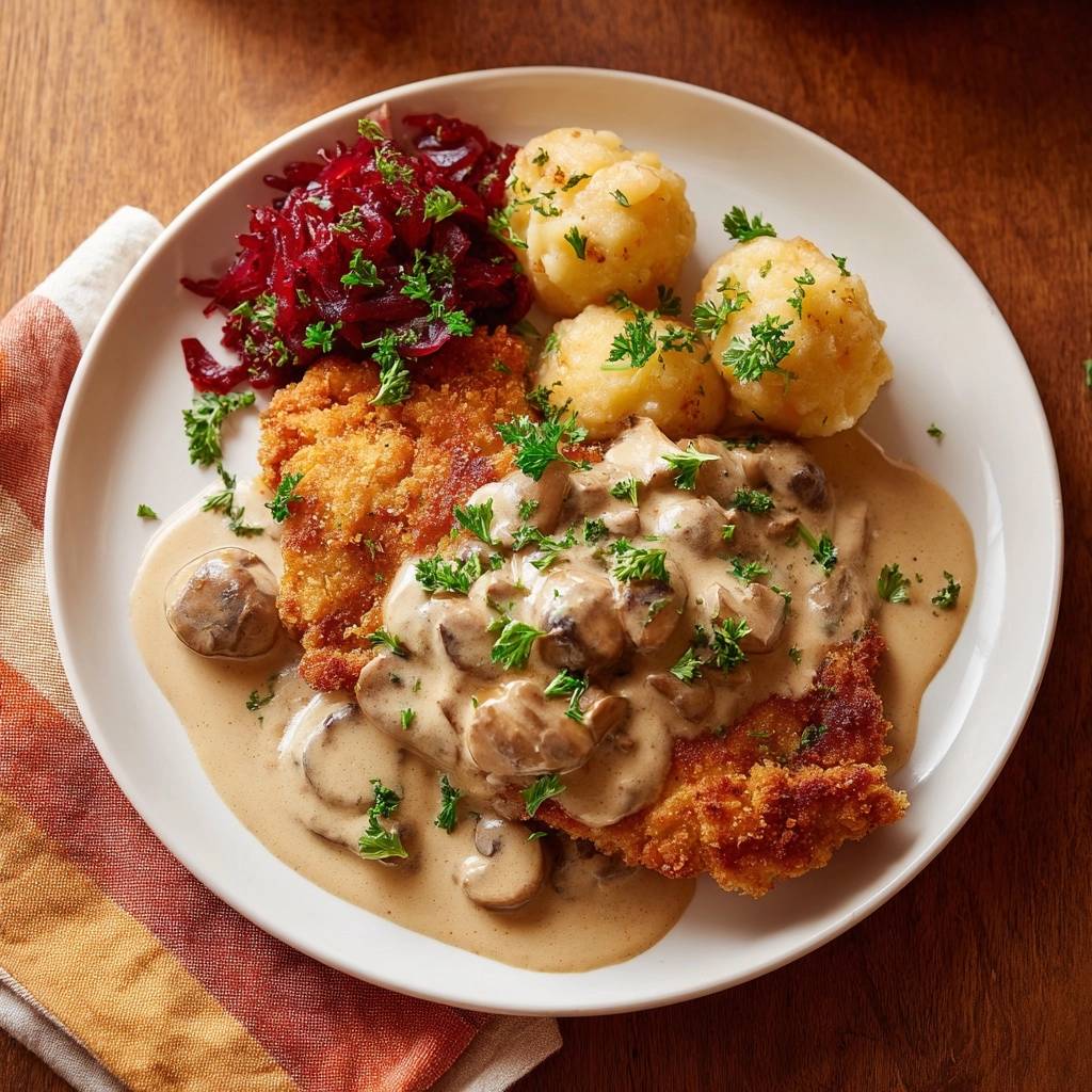 - Anrichten: Schnitzel mit Pilzrahmsauce nappieren, dazu Kartoffeln und Rotkohl servieren, mit Petersilie bestreuen. Guten Appetit!