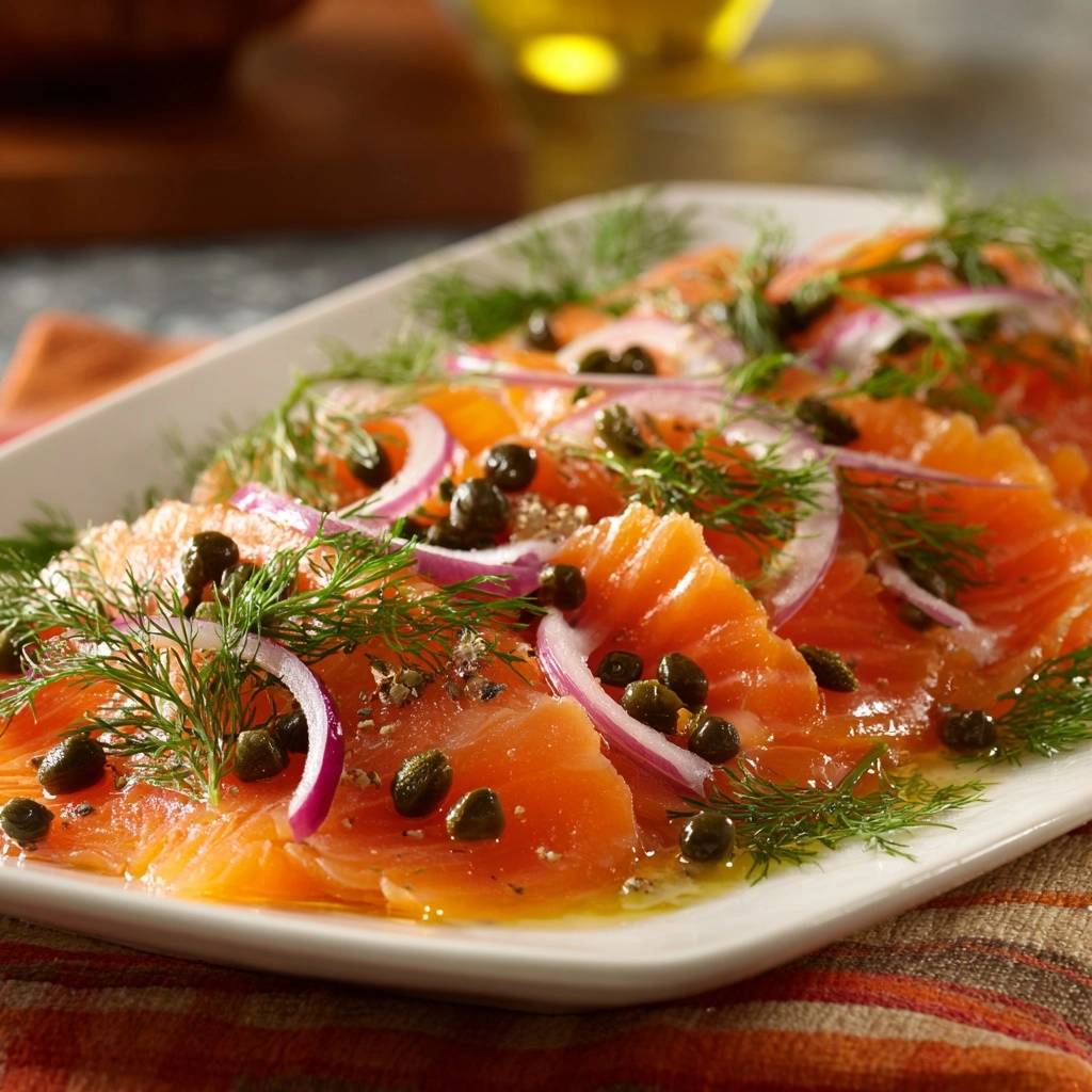 Stell dir vor, du hebst die Gabel zum Mund. Die hauchdünne Lachsscheibe schmilzt butterweich auf der Zunge, umhüllt von frischem Dillduft und knackigen Zwiebelringen. Ein Hauch von salzigen Kapern tanzt mit dem nussigen Olivenöl nach. Das ist pure Freude, du schmeckst den Ozean frisch und saftig.