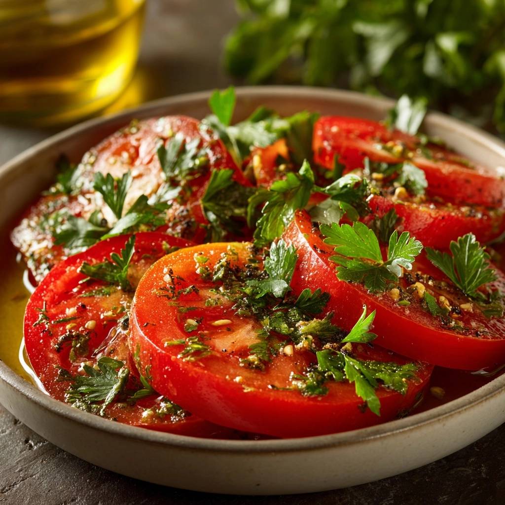 Stell dir vor, du beißt in eine Scheibe Tomate, die knackig bleibt, das Öl glänzt drauf und der Geschmack explodiert: frische Petersilie, Knoblauch, Pfeffer. Kein Tropfen Saft, der alles versaut. Ich hab das so oft erlebt, diese Enttäuschung mit matschigen, wässrigen Marinaden. Früher hab ich Tomaten einfach geschnitten, gewürzt und ab in die Schüssel. Am Ende schwamm alles in einer Pfütze.