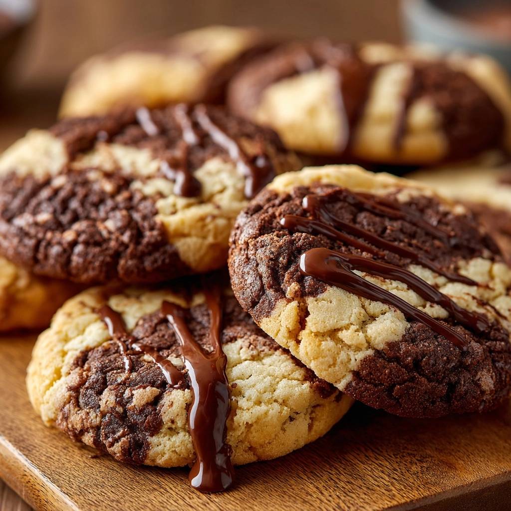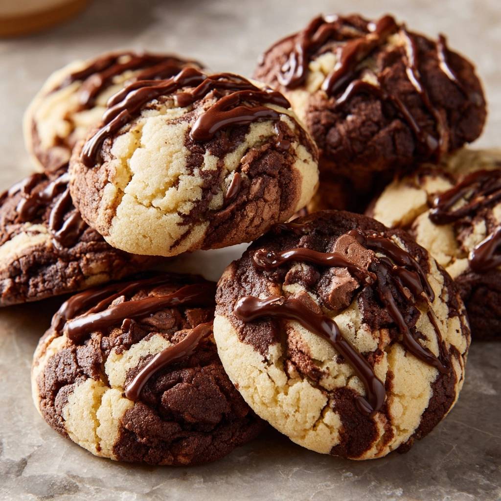 In meiner Küche hab ich das getestet, Portion um Portion. Über 50 Mal, immer Erfolg. Marmorierte Schokoladenkekse (Nie wieder flache Kekse!) mit hellem und dunklem Teig, marmoriert und mit cremigem Guss. Der erste Bissen? Purer Genuss. Der Kontrast aus Texturen macht süchtig.