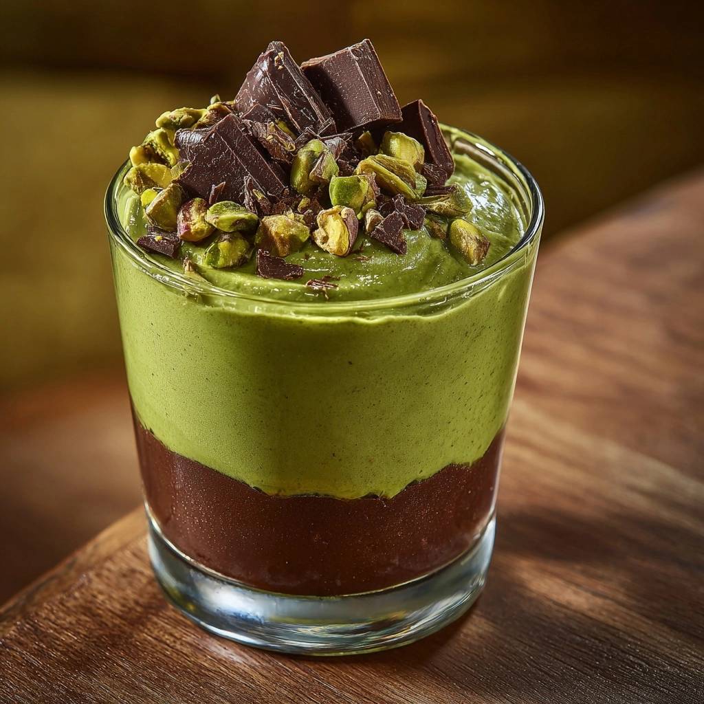- Vor dem Servieren mit gehackten Pistazien und zerkleinerten Schokoladenstücken toppen. Fertig – cremig, schichtfest und unwiderstehlich!