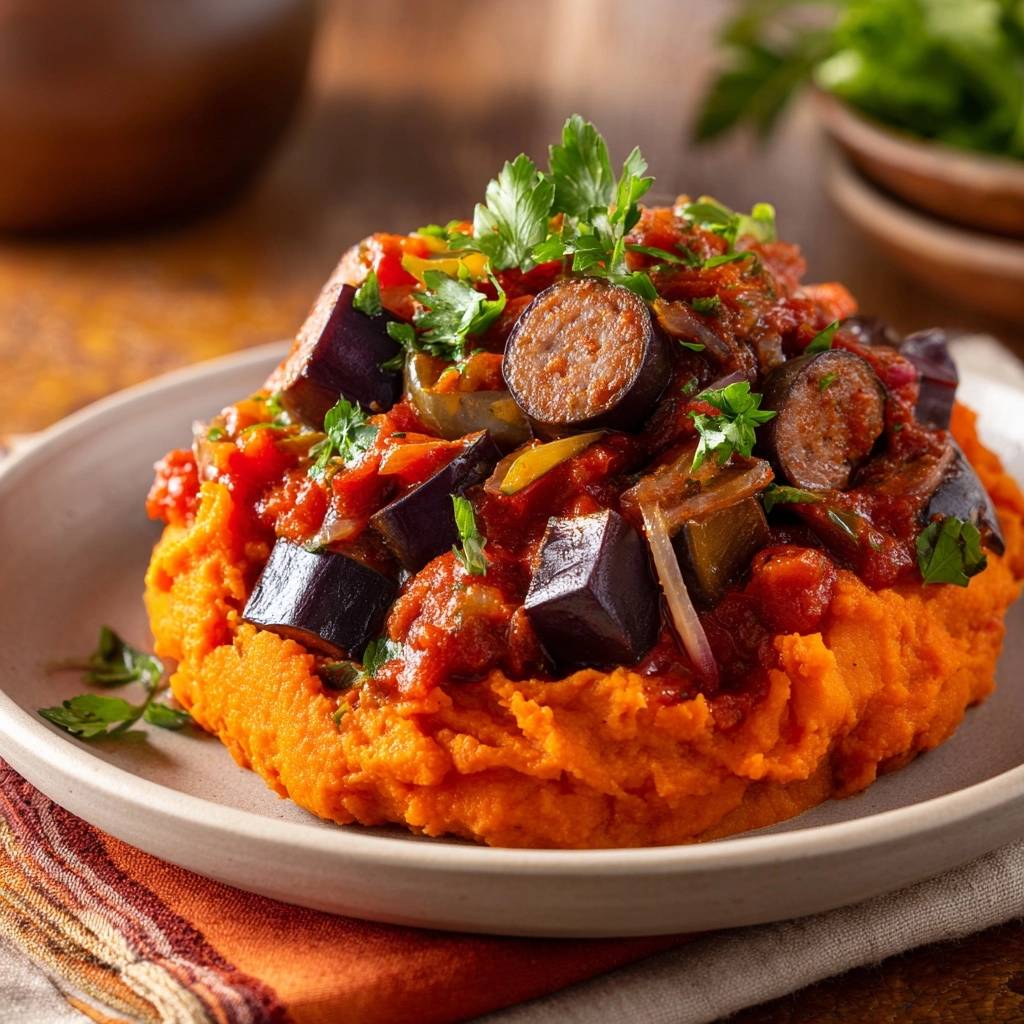 Mediterrane Auberginen-Pfanne mit Wurst auf Süßkartoffelpüree
