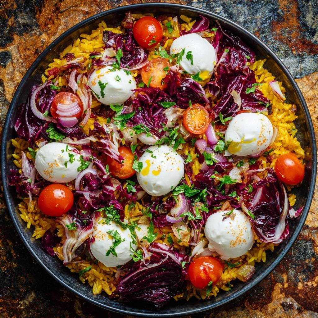 Mediterrane Kurkuma-Reispfanne mit Burrata: Locker & Cremig