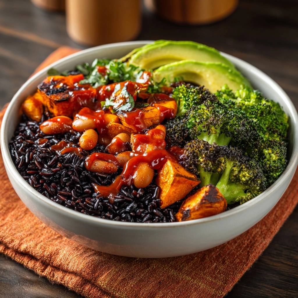 Stell dir vor, du löffelst eine Bowl, bei der jede Komponente genau die richtige Textur hat. Der schwarze Reis hat noch einen leichten Biss, die Süßkartoffeln sind außen fast karamellisiert und der Brokkoli ist an den Spitzen herrlich knusprig.