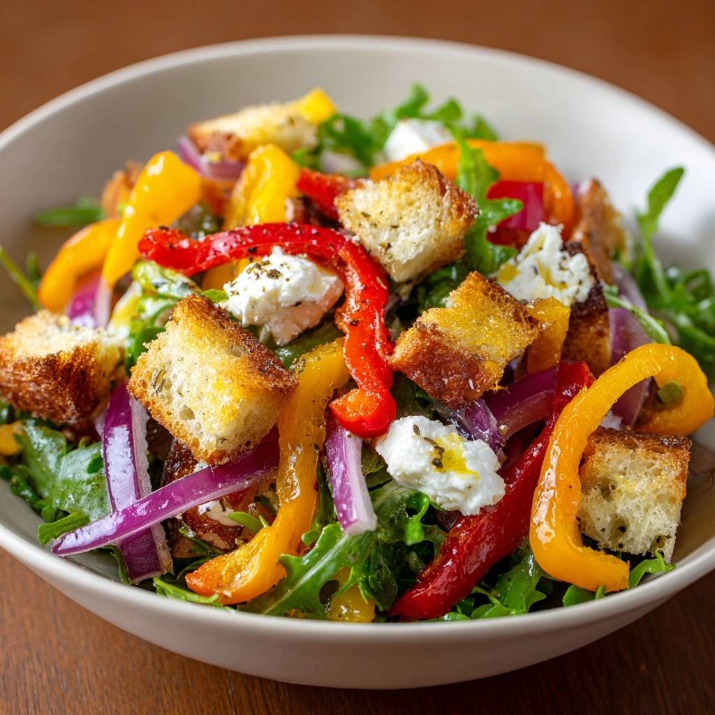 250 Gramm Ciabatta oder Landbrot vom Vortag 1 rote und 1 gelbe Paprika für die Süße 1 rote Zwiebel für die feine Schärfe 100 Gramm Feta (der salzige Kontrast) 2 Handvoll frischer Rucola 4 Esslöffel hochwertiges Olivenöl 2 Esslöffel heller Balsamico oder Weißweinessig 1 Teelöffel getrockneter Oregano 1 Teelöffel Honig für die perfekte Bindung Salz und schwarzer Pfeffer aus der Mühle