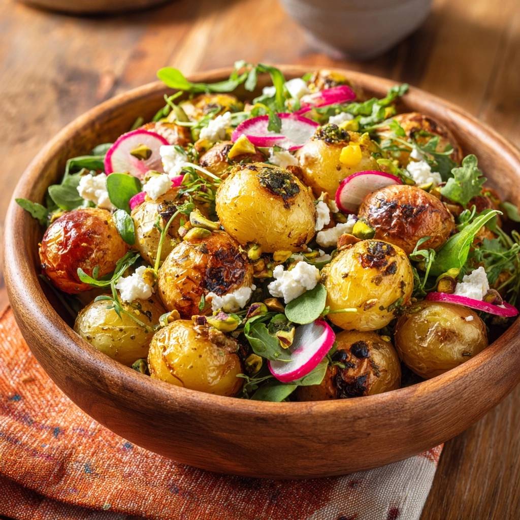 - Anrichten: Hebe den Babyspinat, die Radieschenscheiben und die Kapern vorsichtig unter. Verteile den Salat in einer Holzschüssel. Garniere das Ganze mit den groben Fetastücken, den gehackten Pistazien und träufle das restliche Kräuter-Dressing darüber. Sofort servieren, solange die Kartoffeln noch ihren perfekten Crunch haben.