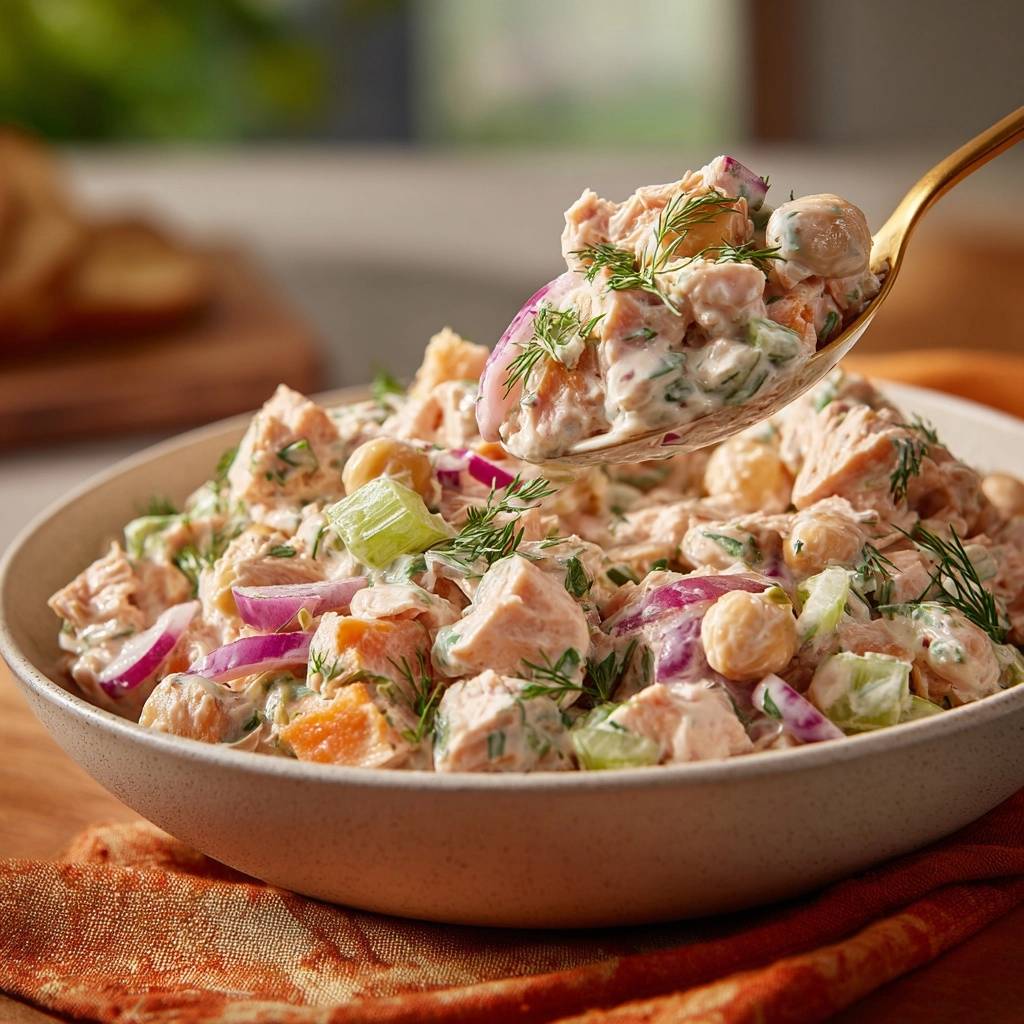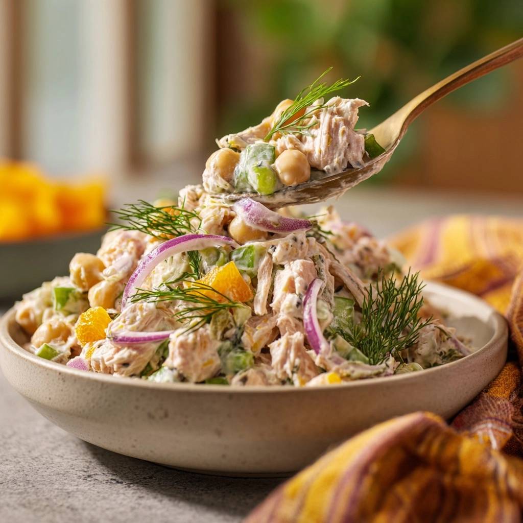 Für veganen Thunfisch-Kichererbsen-Salat: Ersetze Thunfisch durch marinierte Tofu-Würfel oder Kichererbsenmus. Mehr Gemüse statt Joghurt, z. B. Tahini für Cremigkeit.