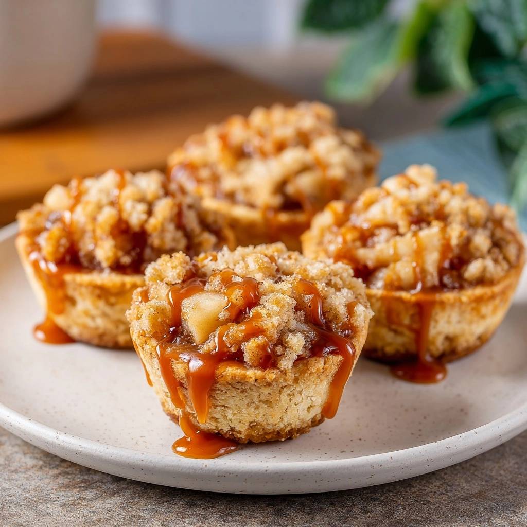 Stell dir vor, du beißt in ein Mini Apfel-Crumble-Törtchen mit Karamellsoße, und der Crumble knuspert so herrlich, dass du fast die Augen zumachst. Der Apfel drin ist saftig, säuerlich, perfekt mit Zimt gewürzt. Die Karamellsoße fließt warm darüber und klebt ein bisschen, genau richtig.