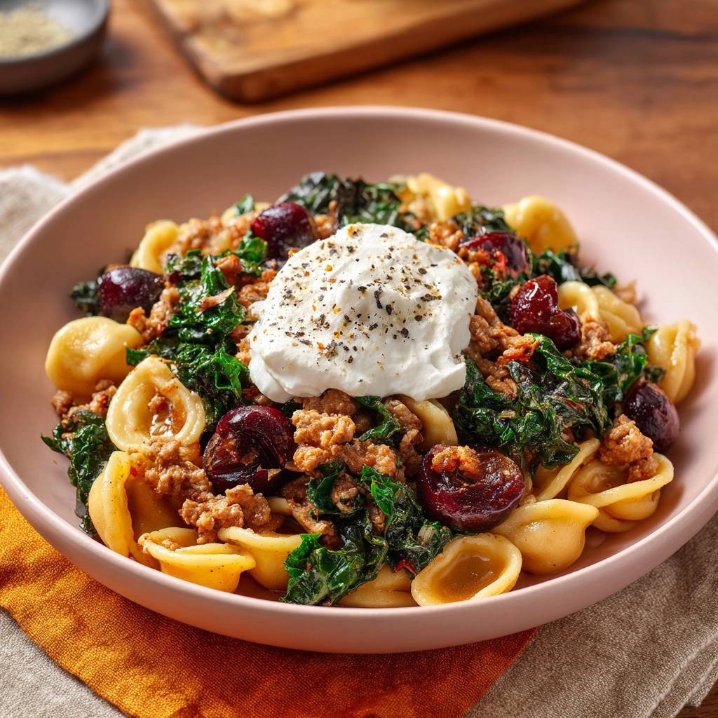 Stell dir vor, du beißt in diese Orecchiette mit Rinderhack, Sauerkirschen, Grünkohl und Ricotta. Der erste Bissen explodiert im Mund: saftiges Hack, knackig-säuerliche Kirschen, zarter Grünkohl, der endlich mal nicht zäh ist, und cremiger Ricotta, der alles rund macht. Du spürst die Wärme des Herbstes, aber mit einem Twist, der süchtig macht.