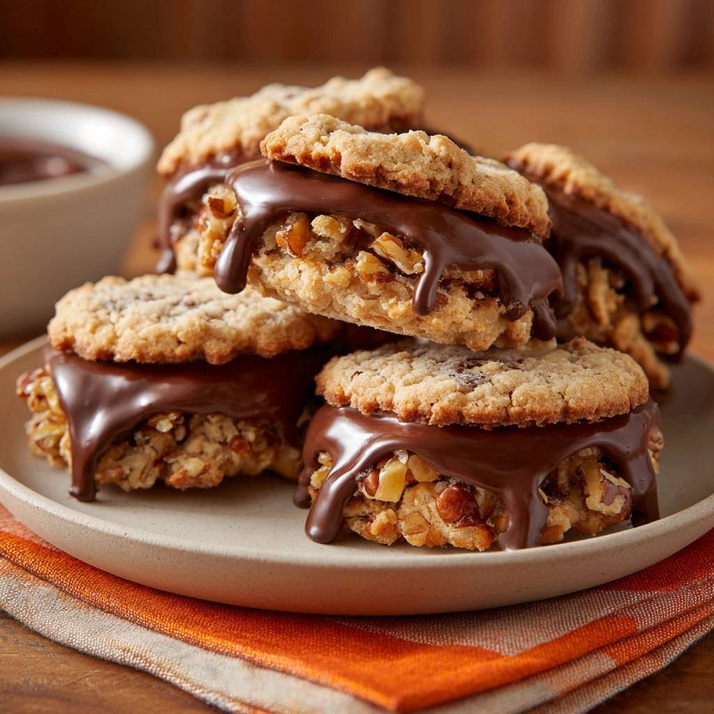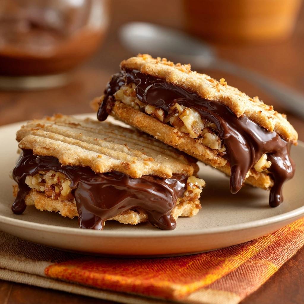 Der erste Biss in diese Pekannuss-Schoko-Sandwich-Kekse ist einfach unschlagbar. Knuspriger Pekannuss-Teig umhüllt cremige, glänzende Schokolade, die leicht über die Ränder tropft. Der Duft von gerösteten Nüssen und warmer Schokolade erfüllt die Küche, und du spürst sofort, warum die das Highlight deines nächsten Kaffeeklatschs werden.
