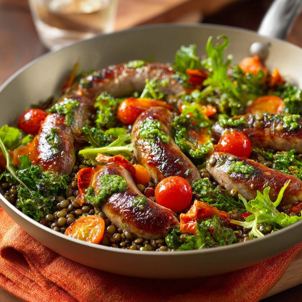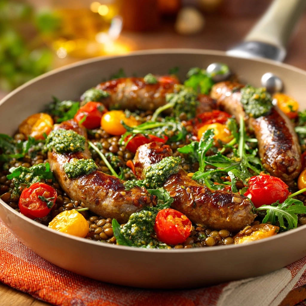 Die Geschmacksbalance dieses Gerichts ist einfach phänomenal. Herzhafte, goldbraun gebratene Bratwürstchen treffen auf erdige, leicht nussige Linsen.