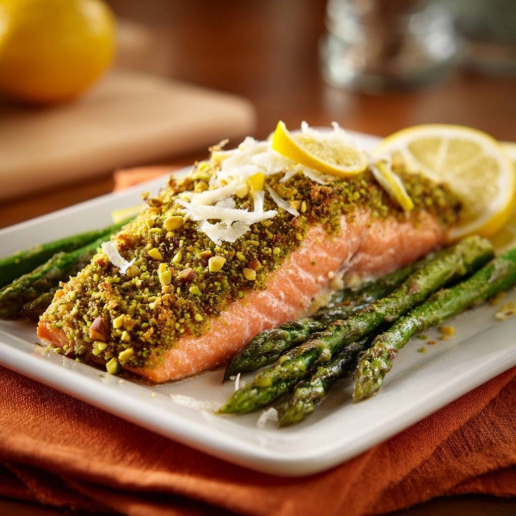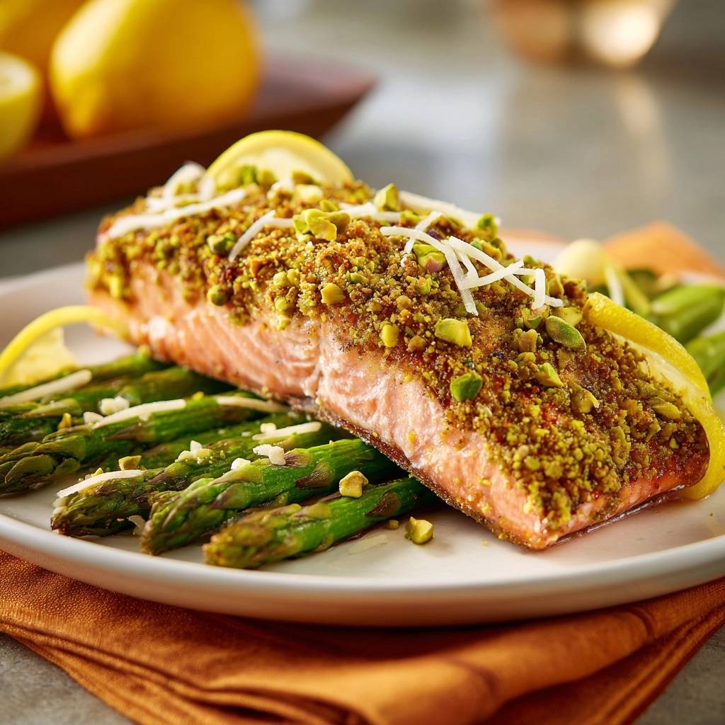 Pistazien-Kokos-Lachs mit Zitronenspargel (Nie wieder trockener Lachs!)