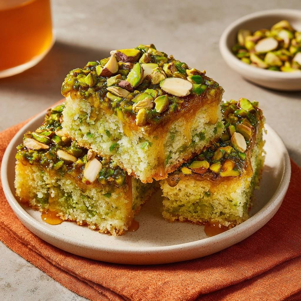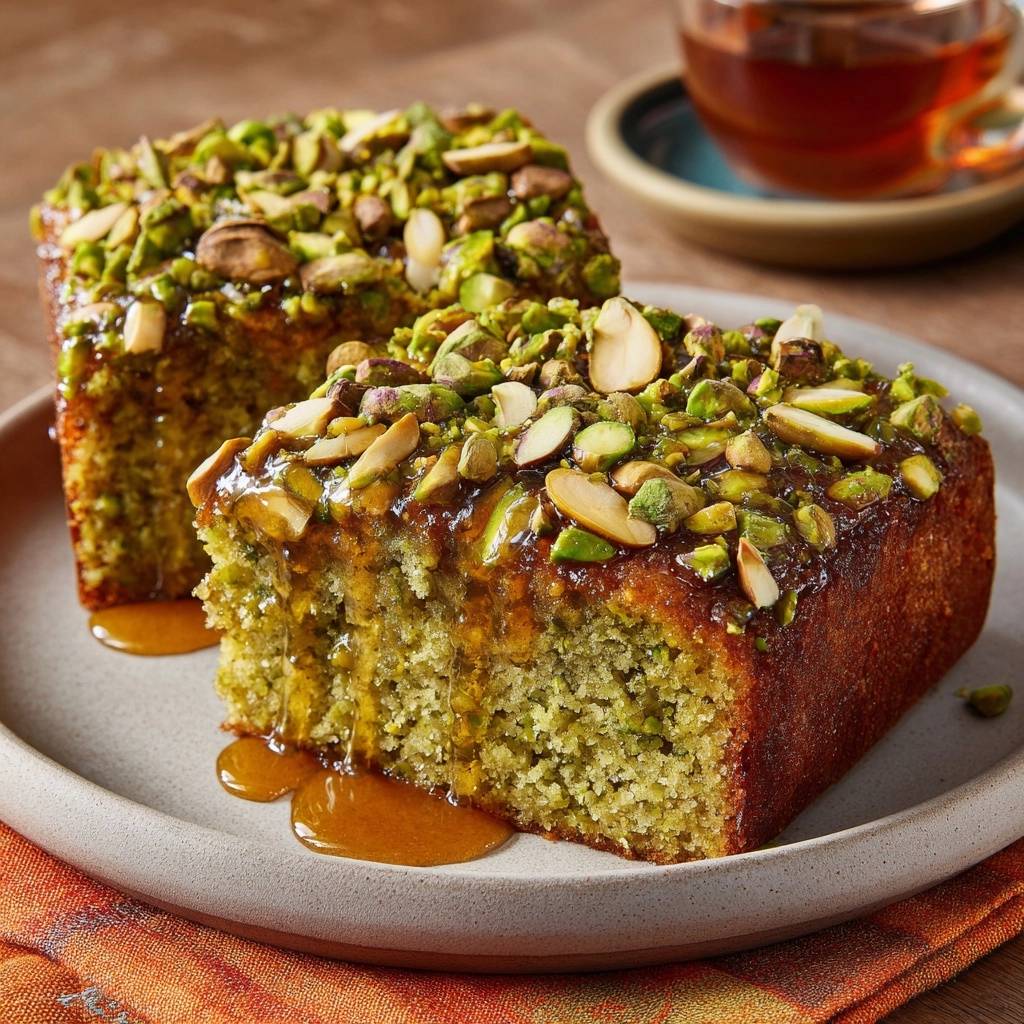 Stell dir vor, du nimmst den ersten Bissen von diesem Pistazien-Sirupkuchen. Saftig, nussig, mit einem Hauch Zitrone, der perfekt durchzieht. Kein Tropfen Sirup läuft ab, nichts wird matschig.