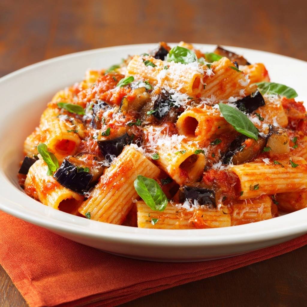 500g Rigatoni 2 mittelgroße Auberginen 800g stückige Tomaten aus der Dose (am besten Polpa für mehr Struktur) 3 Knoblauchzehen 100g Ricotta Salata (der feste, gesalzene Schafskäse ist das Original) 1 Bund frisches Basilikum Hochwertiges Olivenöl (extra vergine) Salz, Pfeffer und eine Prise Zucker Optional: Eine Prise Chiliflocken für die Wärme
