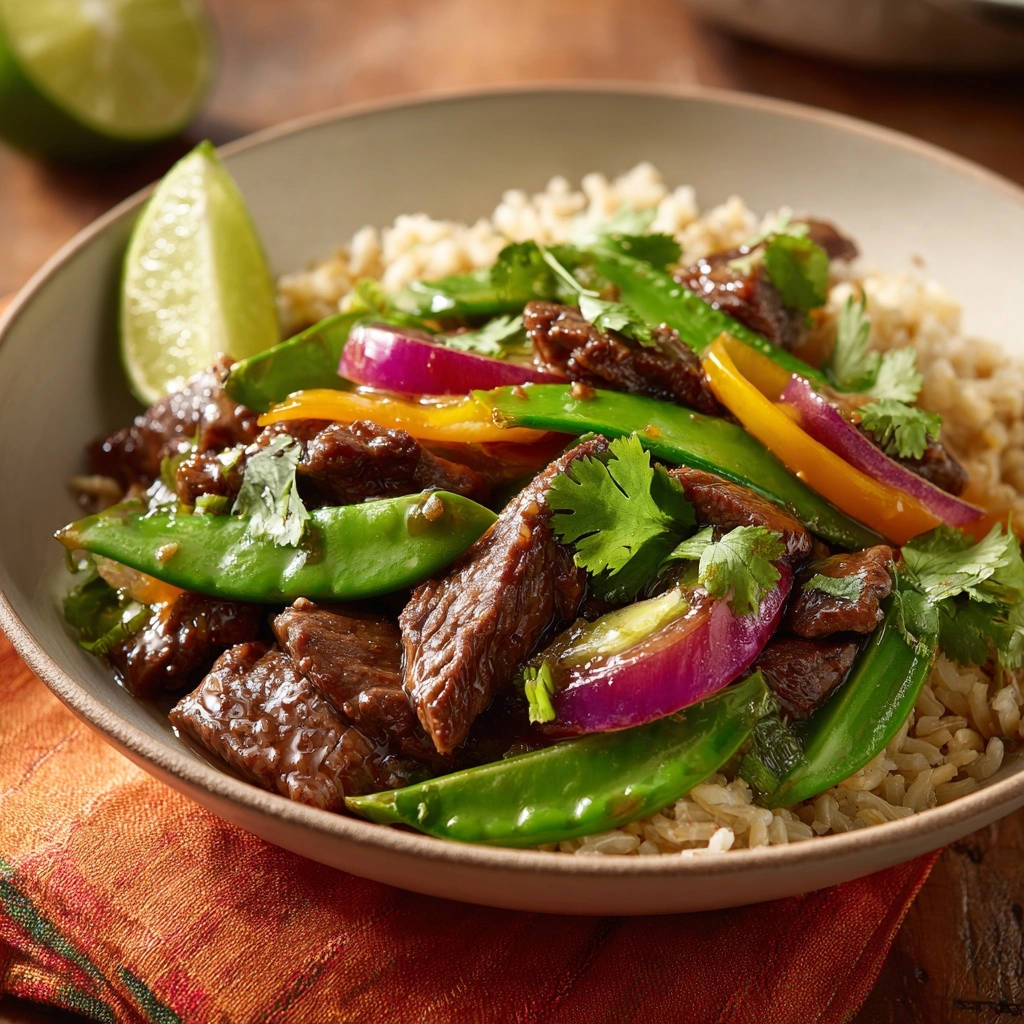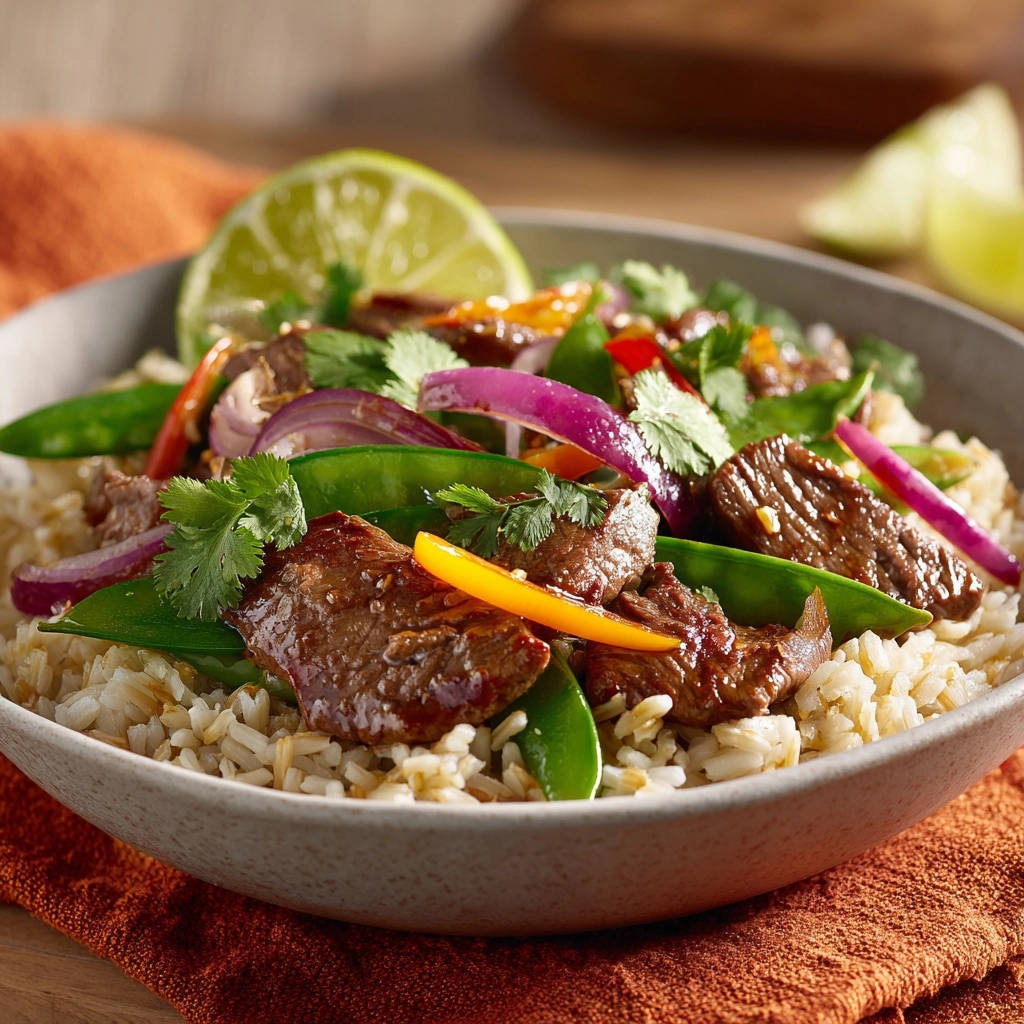 - Servieren: Das Rindfleisch-Stir-Fry sofort auf gekochtem braunem Reis anrichten. Mit frischem Koriander bestreuen und einem Limettenschnitz garnieren. Fertig ist euer perfekt zartes Stir-Fry, das garantiert jeden begeistert!