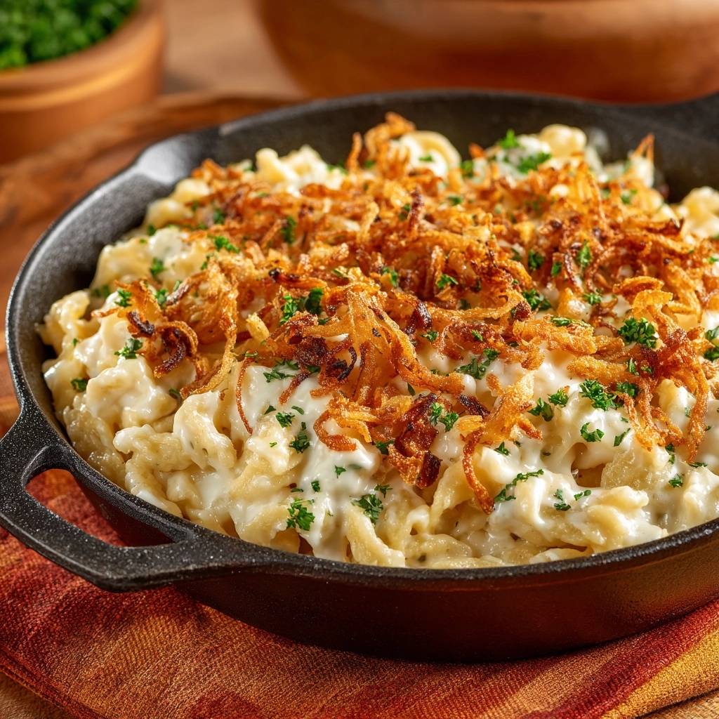 - Knusprige Zwiebelringe und gehackte Petersilie darüberstreuen. Direkt aus der heißen Pfanne servieren – fertig! Der Crunch der Zwiebeln bleibt erhalten, der Käse schmilzt perfekt. Guten Appetit!