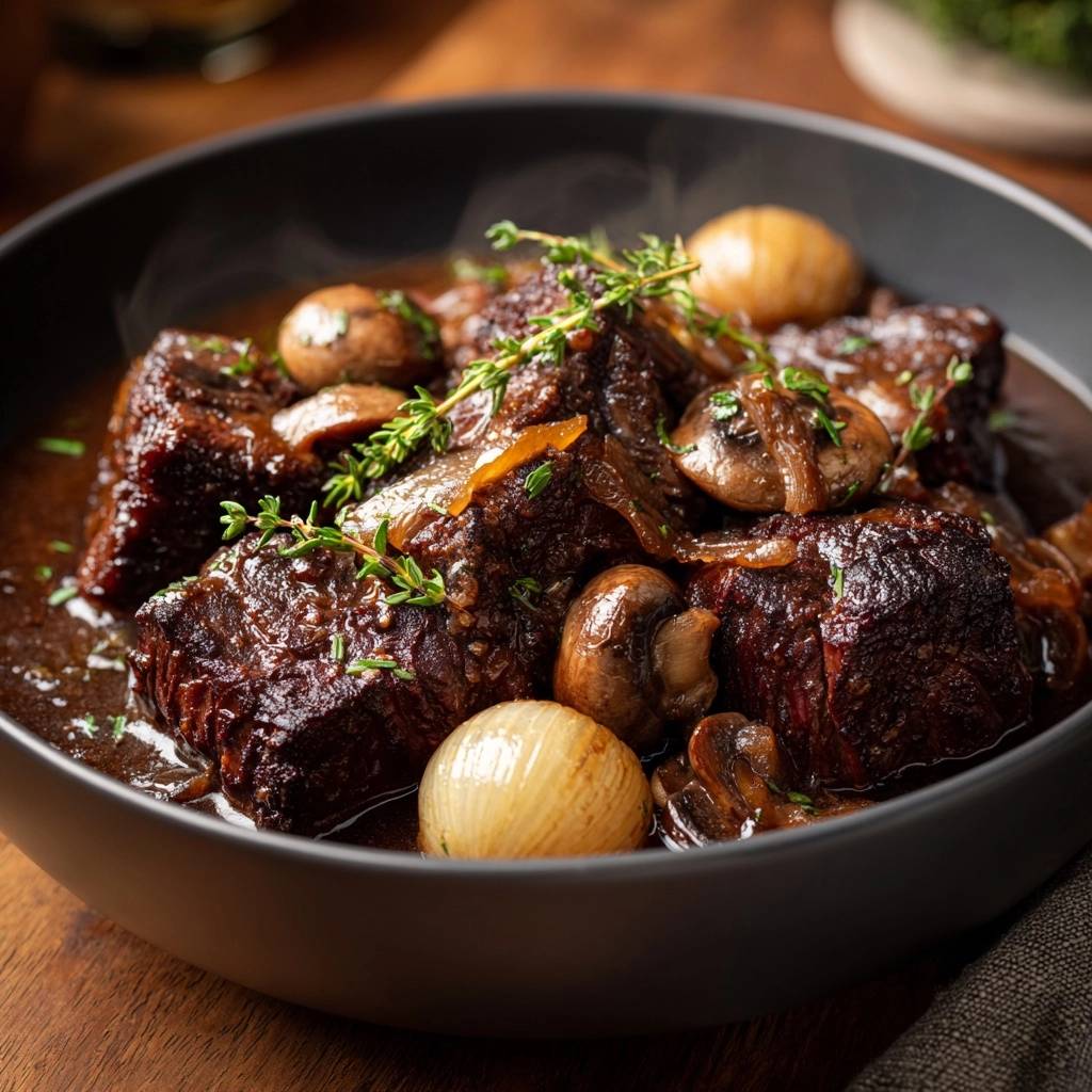 Stell dir vor, du nimmst die erste Gabel dieses Ragouts in den Mund. Das Rindfleisch zerfällt butterweich, Pilze und Perlzwiebeln bringen erdige Süße mit sich. Der Thymian duftet intensiv, die Soße umhüllt alles samtig.
