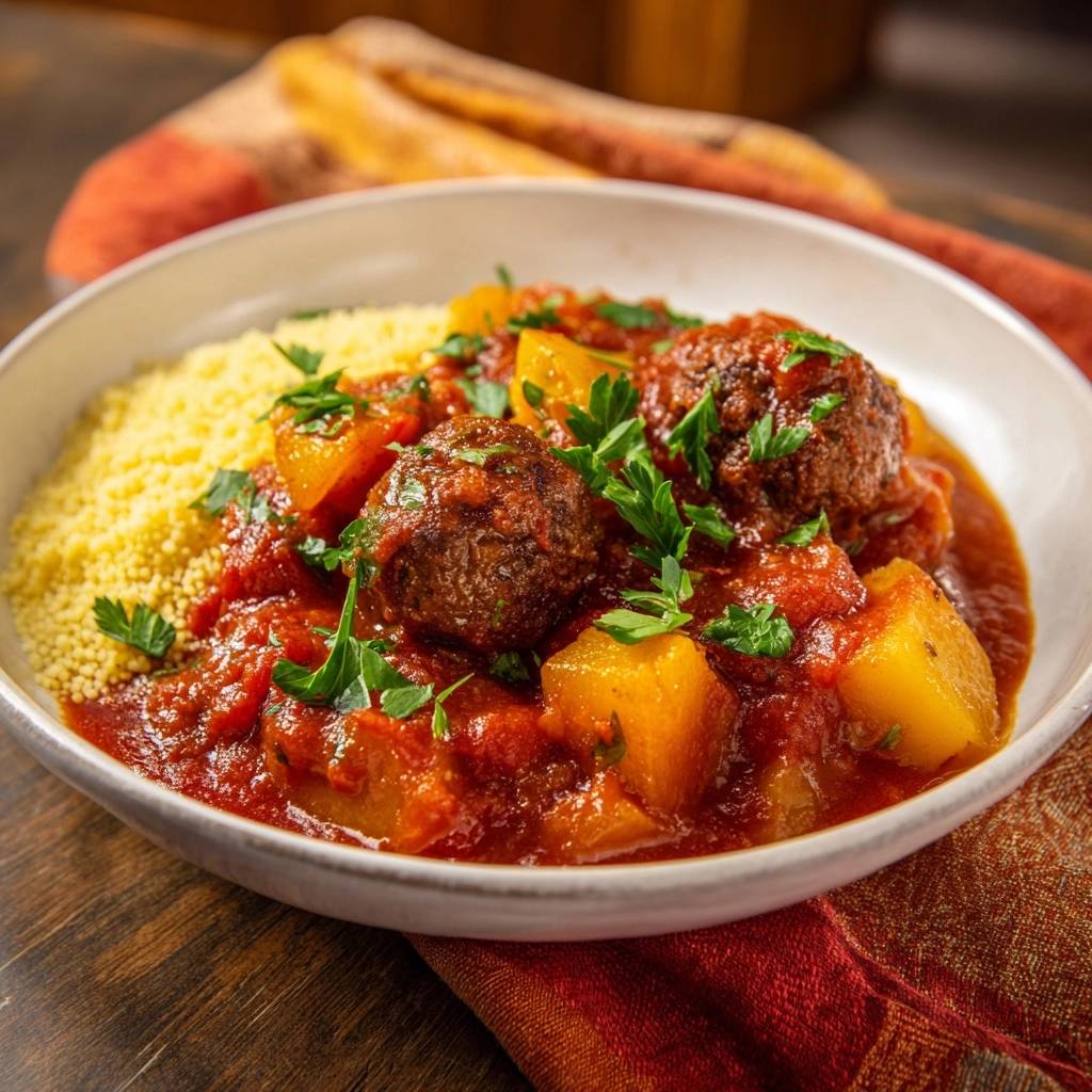 Stell dir vor, du nimmst die erste Gabel voll: saftige Fleischbällchen, die im Mund zerfallen, umhüllt von einer würzigen Tomaten-Kartoffel-Soße. Der Duft von Kreuzkümmel und frischer Petersilie zieht durch die Küche, und der Couscous saugt all die Aromen auf. Das ist mein Rezept für saftige Fleischbällchen-Tagine mit Kartoffeln & Couscous, das jedes Mal zaubert.