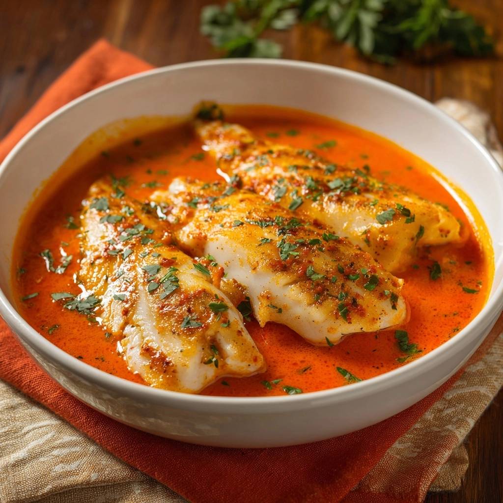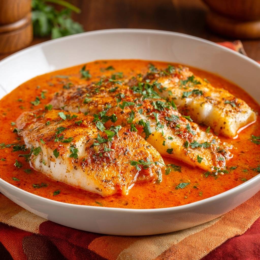 Bestreu mit gehackten Kräutern. Servier mit Reis, Couscous oder Brot. Der Kontrast aus knusprigem Fisch und cremiger Sauce ist unschlagbar.