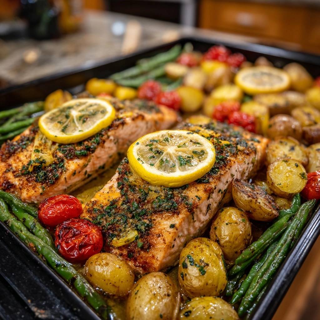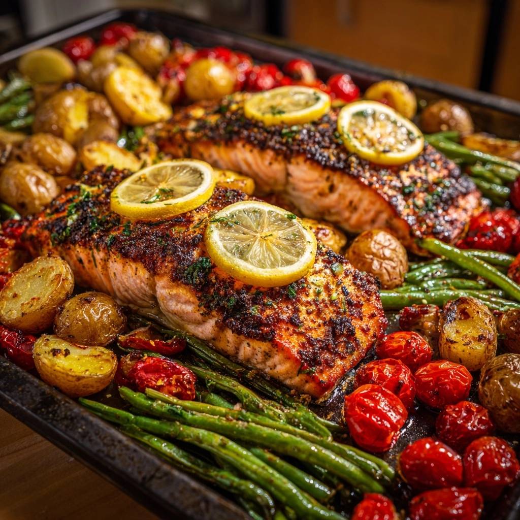 Saftiger Ofenlachs mit Babykartoffeln, Bohnen & Tomaten