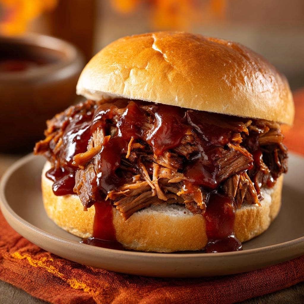 - Brötchen halbieren, leicht anrösten. Pulled Beef darauf füllen, extra Sauce drüberträufeln. Fertig – saftig, zart, unwiderstehlich!