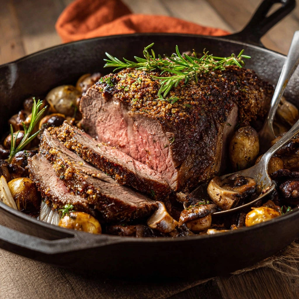 Saftiger Rinderbraten mit Kräuterkruste und Ofenpilzen