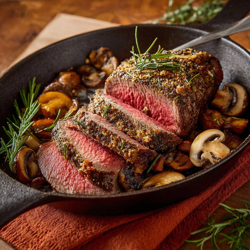 Servieren Sie ihn direkt aus der Pfanne mit den aromatischen Ofenpilzen und frischem Rosmarin.