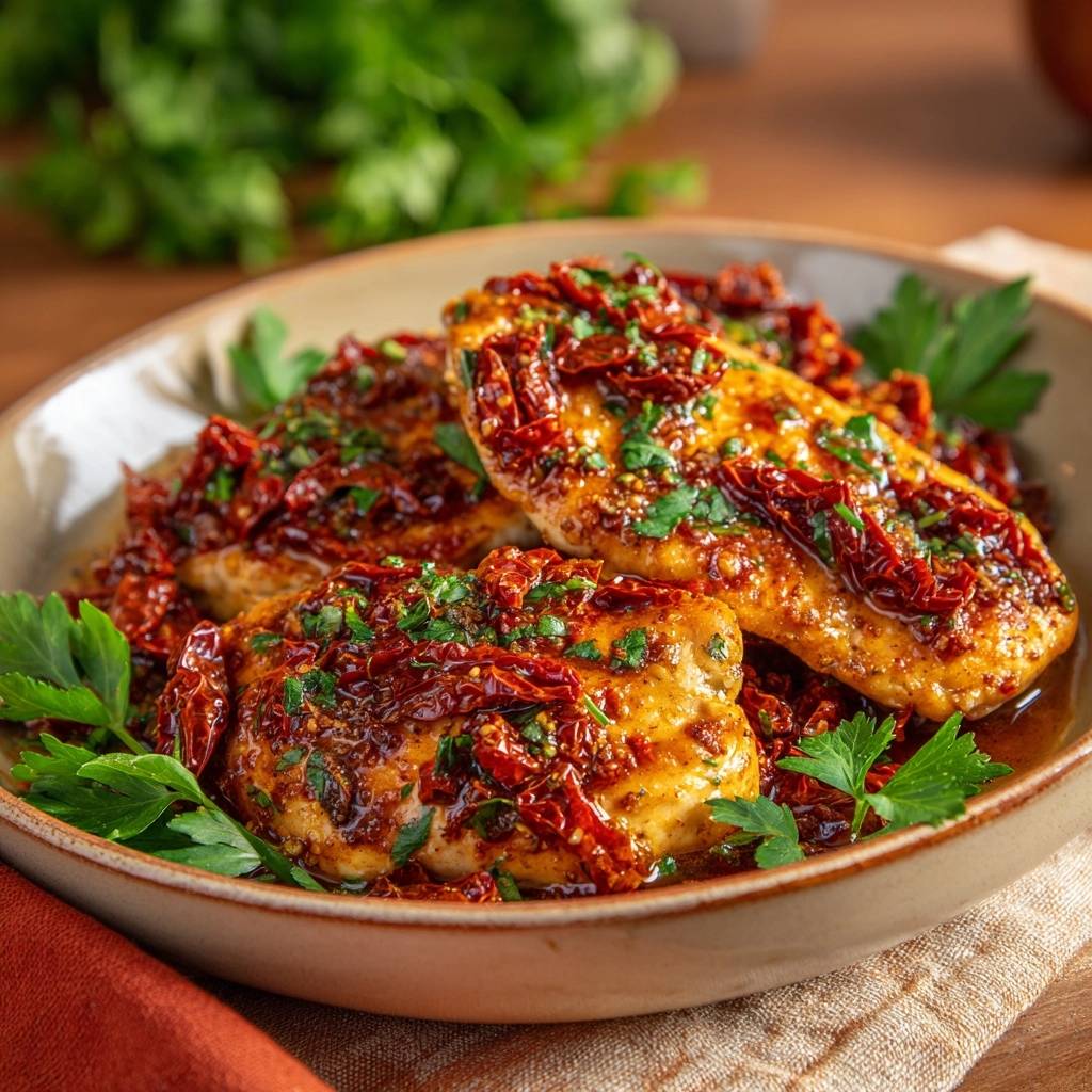 Der Duft steigt auf, wenn die Tomaten ihr Öl abgeben. Jeder Bissen explodiert vor Süße und Würze. Probier’s aus, du wirst nie mehr trockenes Hähnchen essen wollen.
