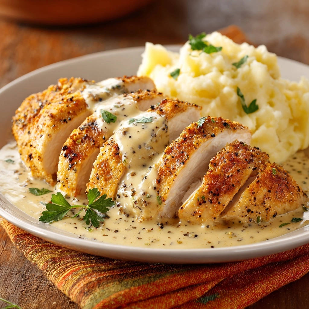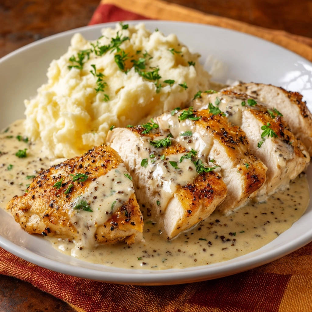 Vergessen Sie alles, was Sie über trockene Hähnchenbrust wissen – dieses Rezept verwandelt sie in eine kulinarische Offenbarung, bei der jeder Bissen ein Fest für die Sinne ist, umhüllt von einer würzigen Pfeffer-Senf-Sauce und begleitet von himmlisch cremigem Kartoffelstampf.