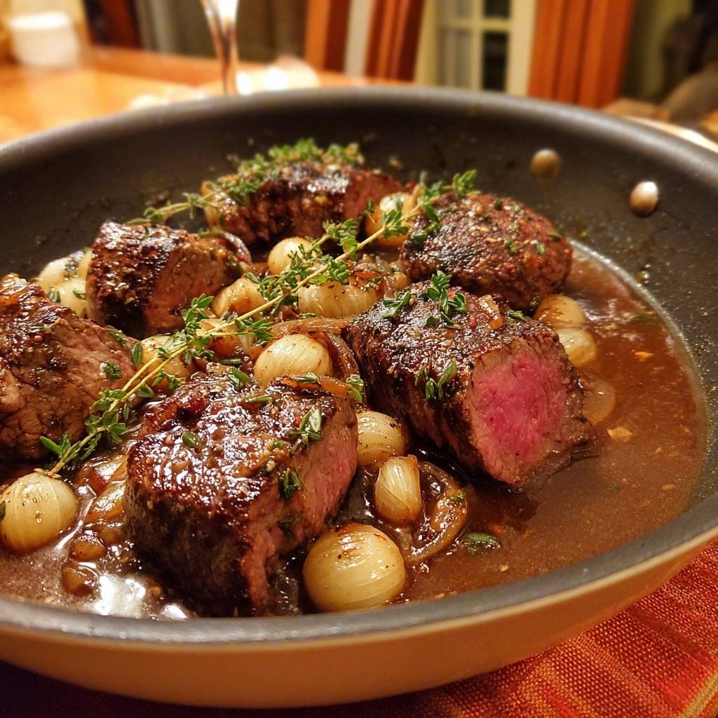 Stell dir vor, du beißt in ein Rinderfilet, das außen knusprig bräunt und innen rosa saftig schmilzt. Der Duft von Thymian, Knoblauch und Perlzwiebeln steigt auf, während die Buttersoße jeden Bissen umhüllt. Nie wieder trockenes Fleisch!