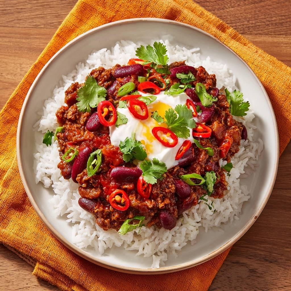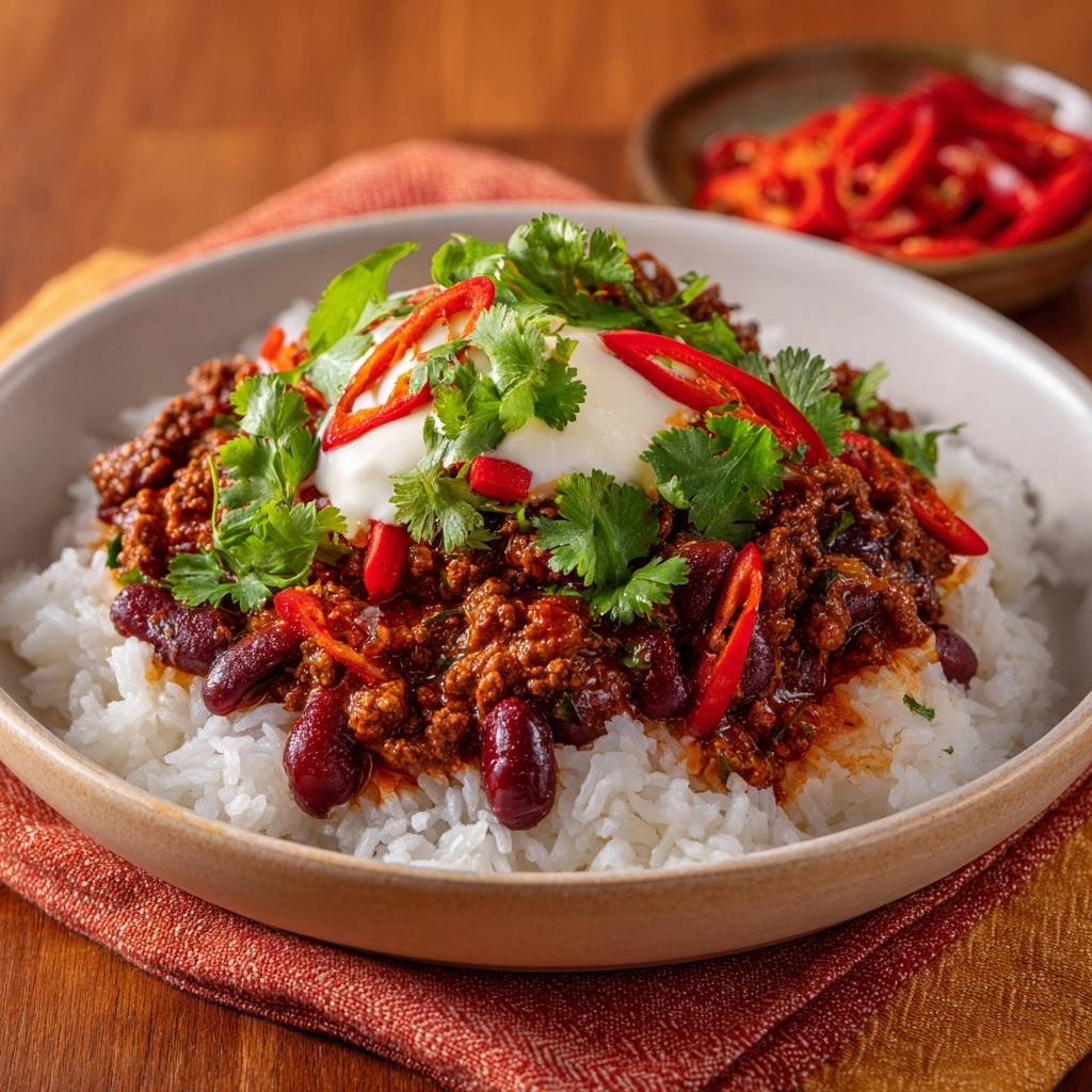 - Reis in Schalen verteilen, Chili daraufgeben. Mit einem Klecks saurer Sahne oder Joghurt, frischem Koriander und Chiliringen toppen. Fertig – perfekte Konsistenz garantiert!