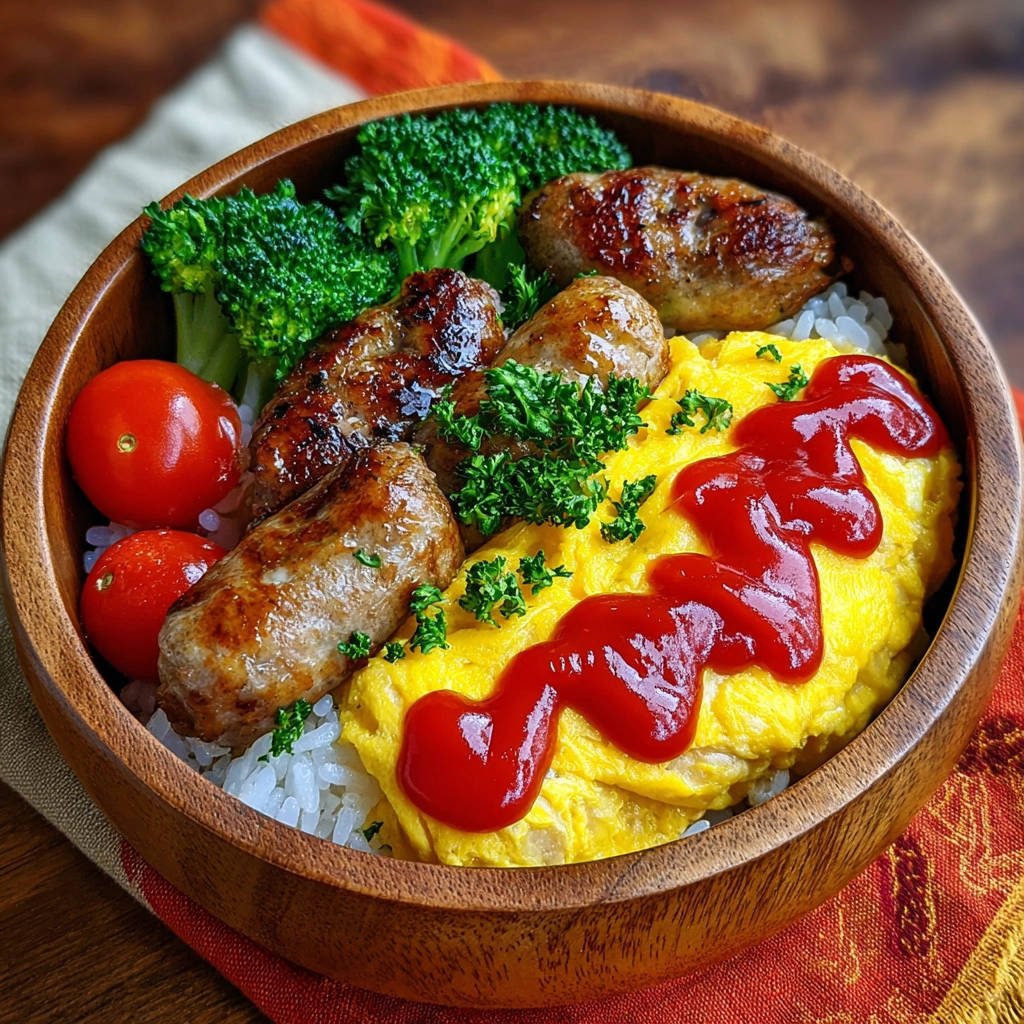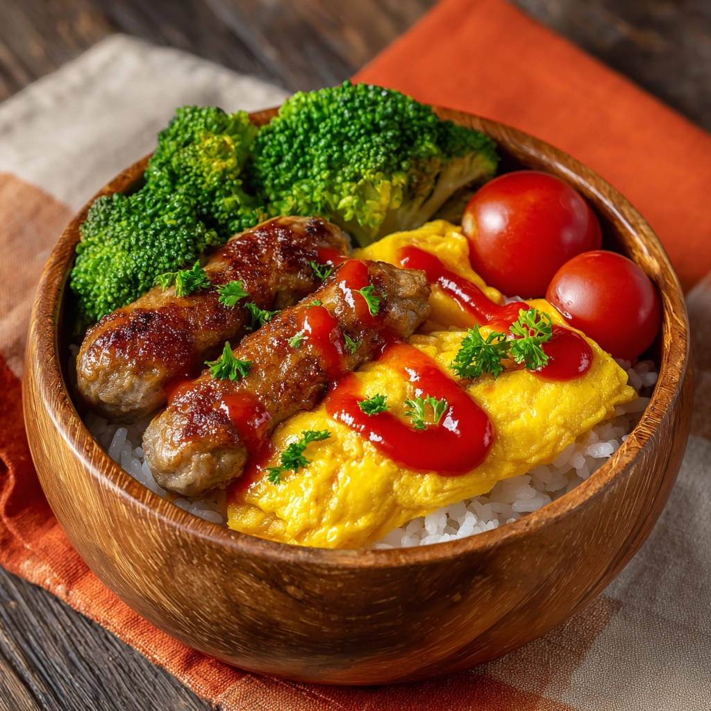 - Bowl anrichten: Geben Sie den gekochten Reis in eine Schüssel. Richten Sie das cremige Rührei direkt daneben an. Fügen Sie die gebratenen Würstchen, die Brokkoliröschen und die halbierten Kirschtomaten hinzu.