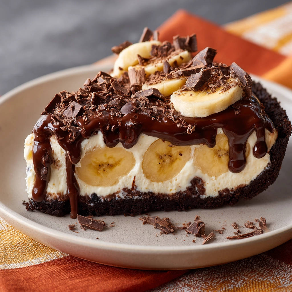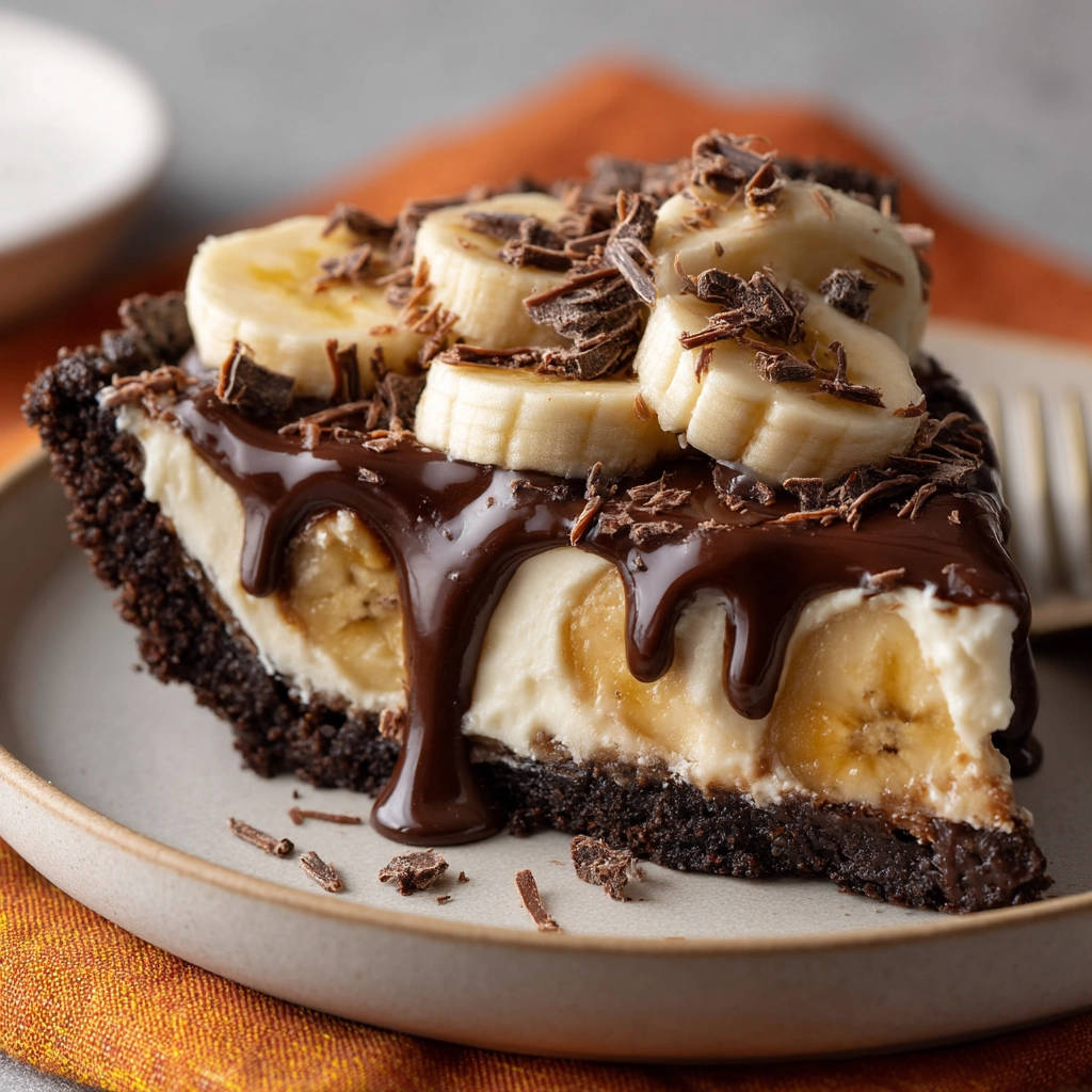 - Schichten aufbauen: Verteilen Sie die Bananenscheiben gleichmäßig auf dem festen Schokoladenboden. Geben Sie dann die gesamte Frischkäsefüllung über die Bananen und streichen Sie die Oberfläche glatt.