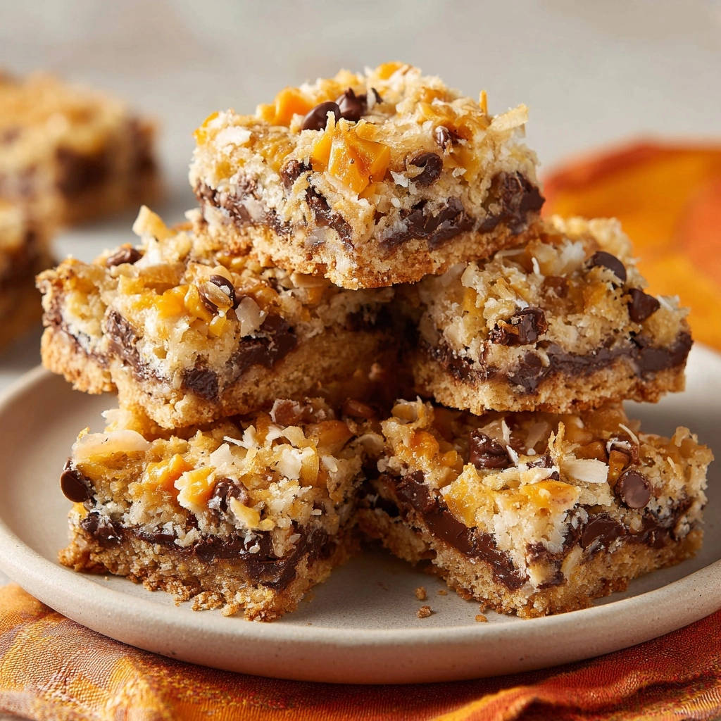- Füllung schichten: Die gezuckerte Kondensmilch gleichmäßig über den vorgebackenen Boden gießen. Anschließend die Zartbitter-Schokostückchen, Milchschokoladen-Chips, Karamell-Chips und Kokosraspel gleichmäßig darüber streuen, sodass alle Zutaten gut verteilt sind und eine schöne Schicht bilden.