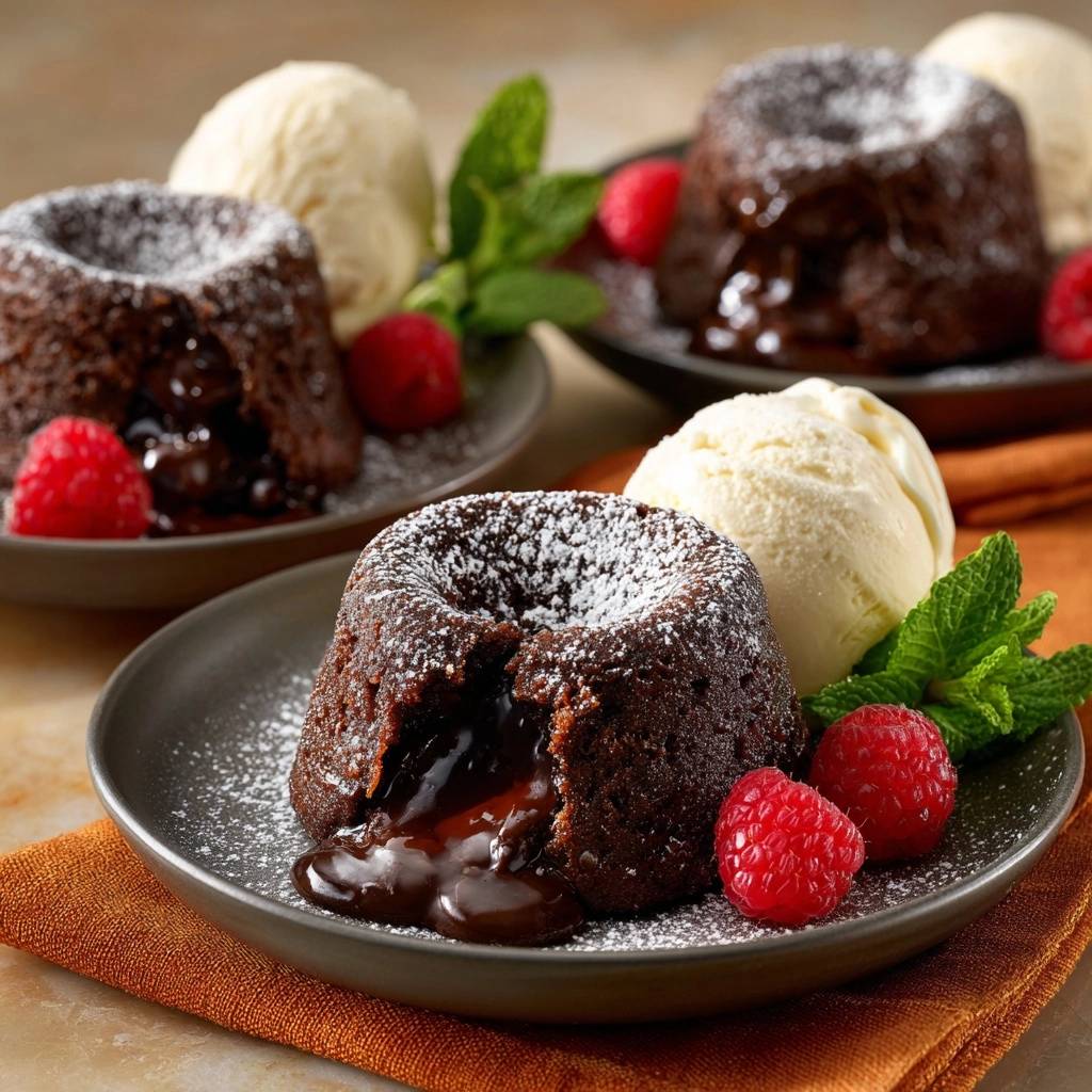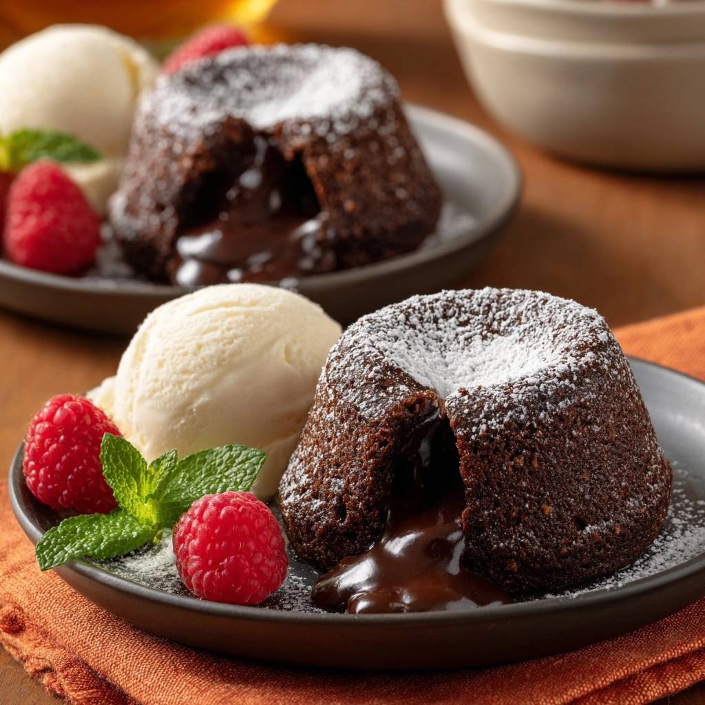 Vanilleeis schmilzt perfekt in die Lava. Himbeeren bringen Säure, Minze Frische. Alternative: Schlagsahne oder gehackte Pistazien für Knusprigkeit.