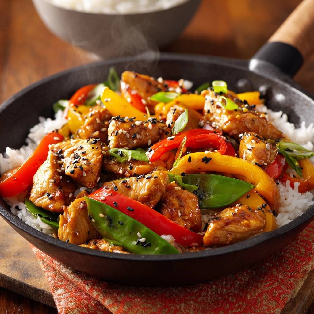 Der erste Bissen explodiert im Mund: saftiges Hähnchen, das zart schmilzt, umhüllt von glänzender Sesamsauce. Knackige Paprikastreifen und frische Snow Peas knacken dazu, während Sesamsamen knusprig mitschwingen. Du riechst den frischen Ingwer und den süßen Honigduft schon aus der Küche.